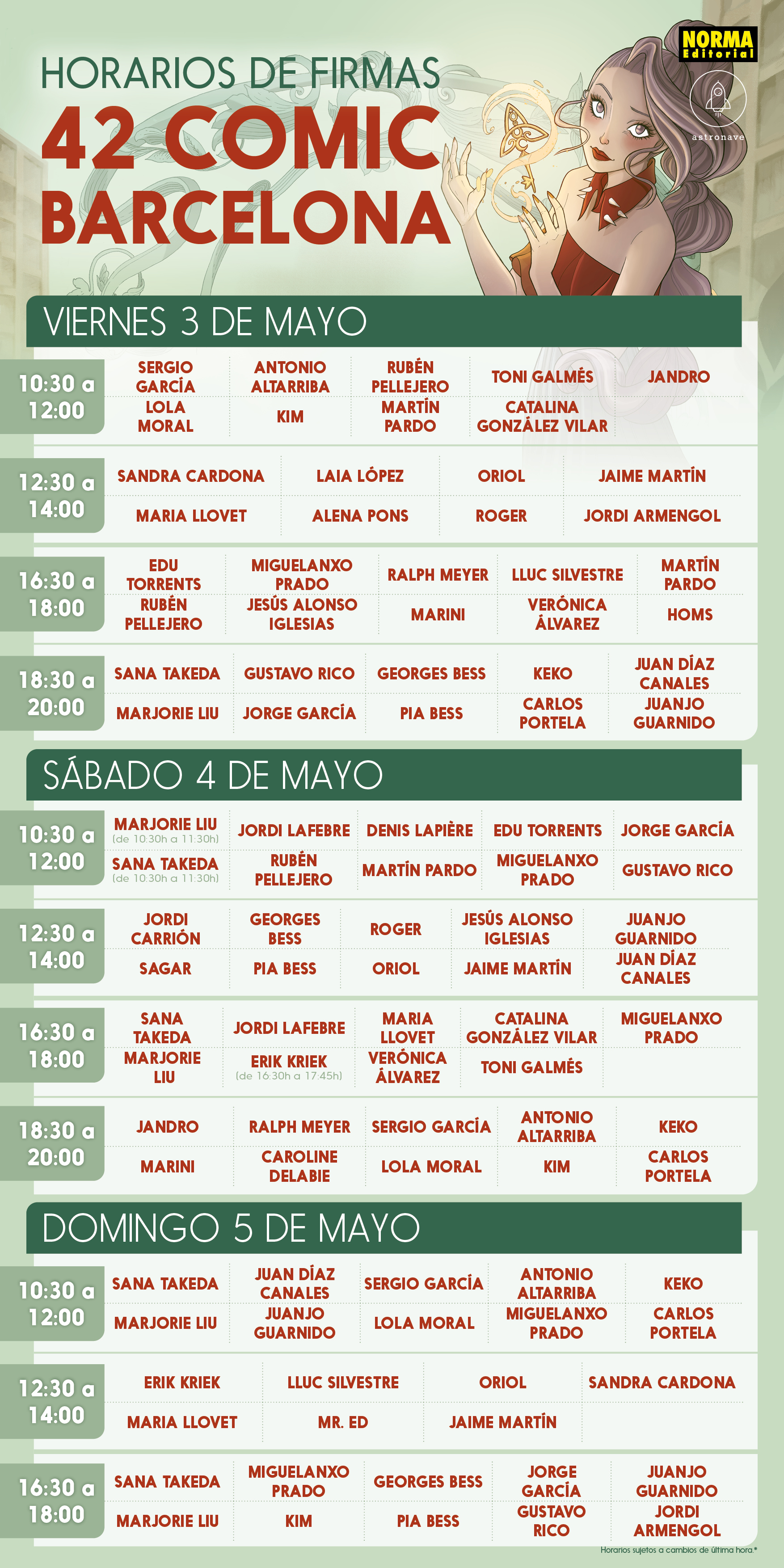 ¡Ya se acerca una de las fechas más señaladas del cómic en España... el COMIC BARCELONA! Para la 42 edición del evento contaremos con muchísimos/as artistas firmando en nuestro stand. En la imagen tenéis detallados todos lo horarios: