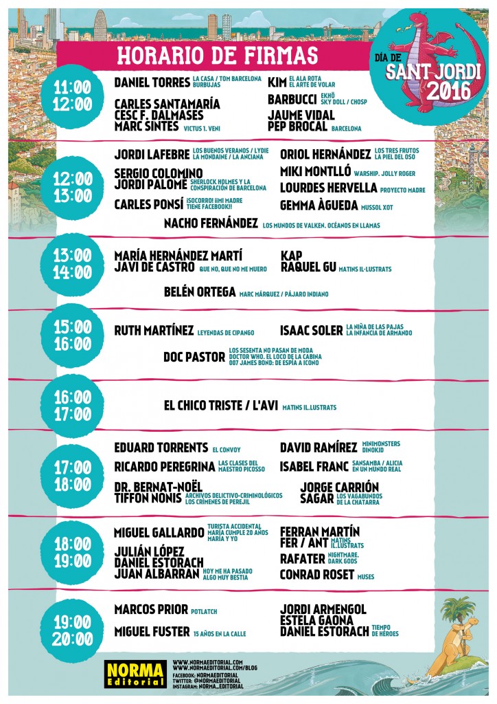 Este es el horario de firmas de nuestro stand que estará situado en frente de Norma Comics (Passeig de Sant Joan, nº 9, Barcelona). ¡Os esperamos!