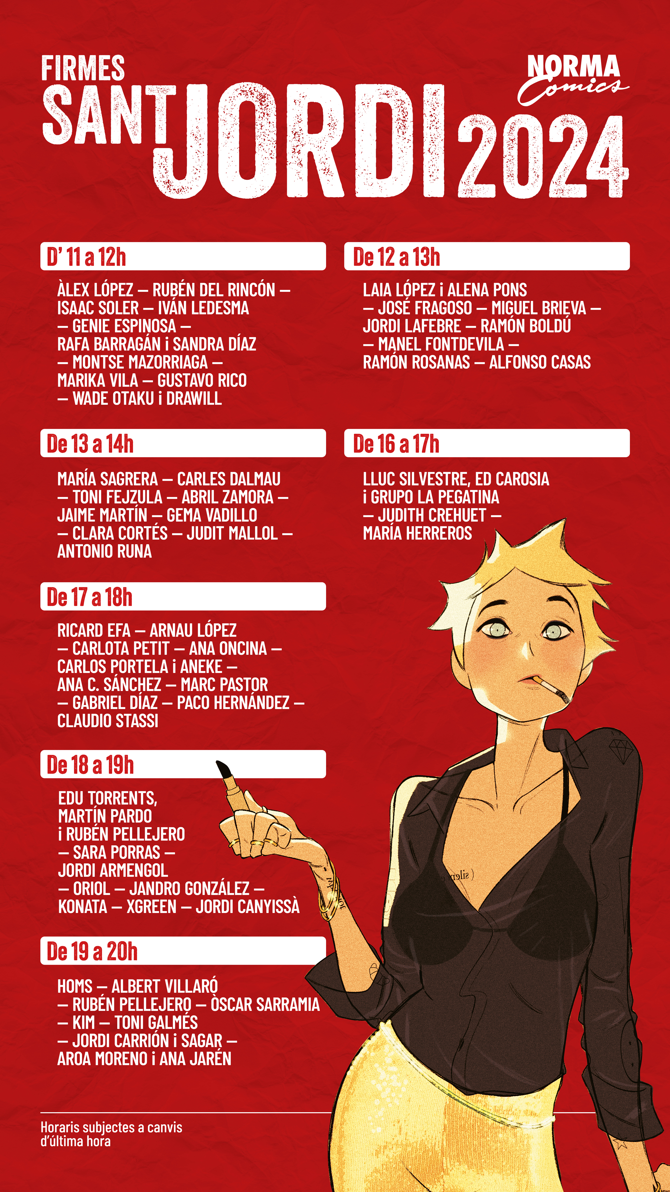 Ya se acerca una de las fechas más bonitas del año... ¡Sant Jordi o el Día del Libro! En la imagen tenéis los horarios de firmas para el próximo 23 de abril delante de Norma Comics (Passeig de Sant Joan, nº9, Barcelona), en la parada de la tienda encontraréis varios de nuestros autores y autoras a lo largo del día.