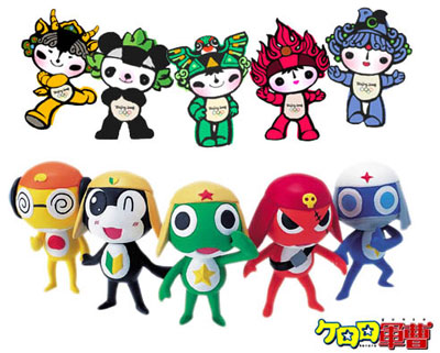 El sargentoKeroro sigue siendo noticia: ahora resulta que los Friendlies, las 5 mascotas olímpicas creadas para los juegos de Beijing, a celebrar en 2008, son una imitación barata de las 5 ranas protagonistas del manga de Mine Yoshizaki. El productor de la serie de anime de Keroro ya ha presentado un pleito por plagio. Aquí os presentamos las respectivas imágenes de ambos grupos de personajes, para que podáis comprobar si realmente puede o no hablarse de plagio. ¿Cuál es vuestra opinión?