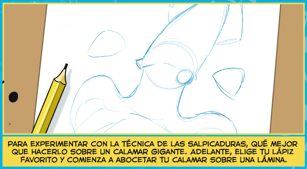 Y además,podrás seguir aprendiendo y perfeccionando tus habilidades de dibujante en esta nueva entrega donde aprenderemos la técnica de salpicaduras con... ¡un calamar gigante! ¿preparado para dibujar? coge tu lápiz favorito y a disfrutar.