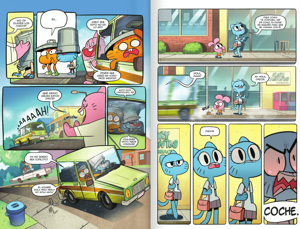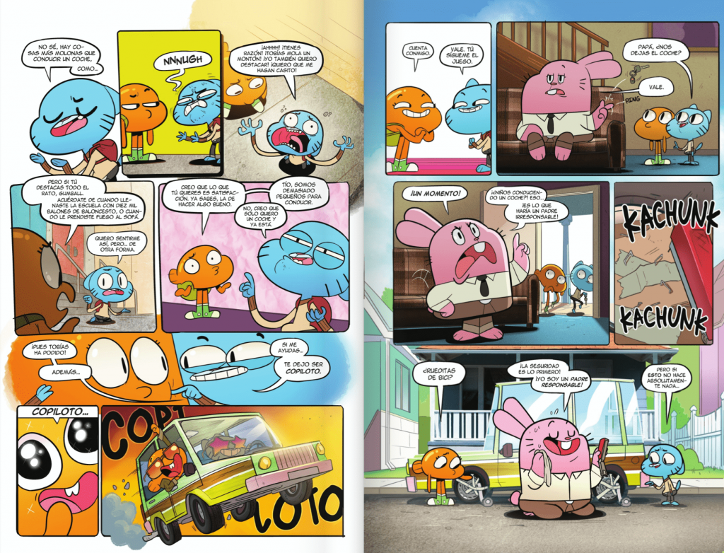 Los Watterson viven nuevas aventuras tronchantes en su nueva serie de cómics. ¿Gumball y Darwin jugando a pillar? ¿Muertos de haaaaaaaambreeeeeee? ¡¿Conduciendo el coche de mamá?! ¡¿HACIENDO KÁRATE?! ¡Todo esto y mucho más lo encontrarás en el cómic de El asombroso mundo de Gumball!
