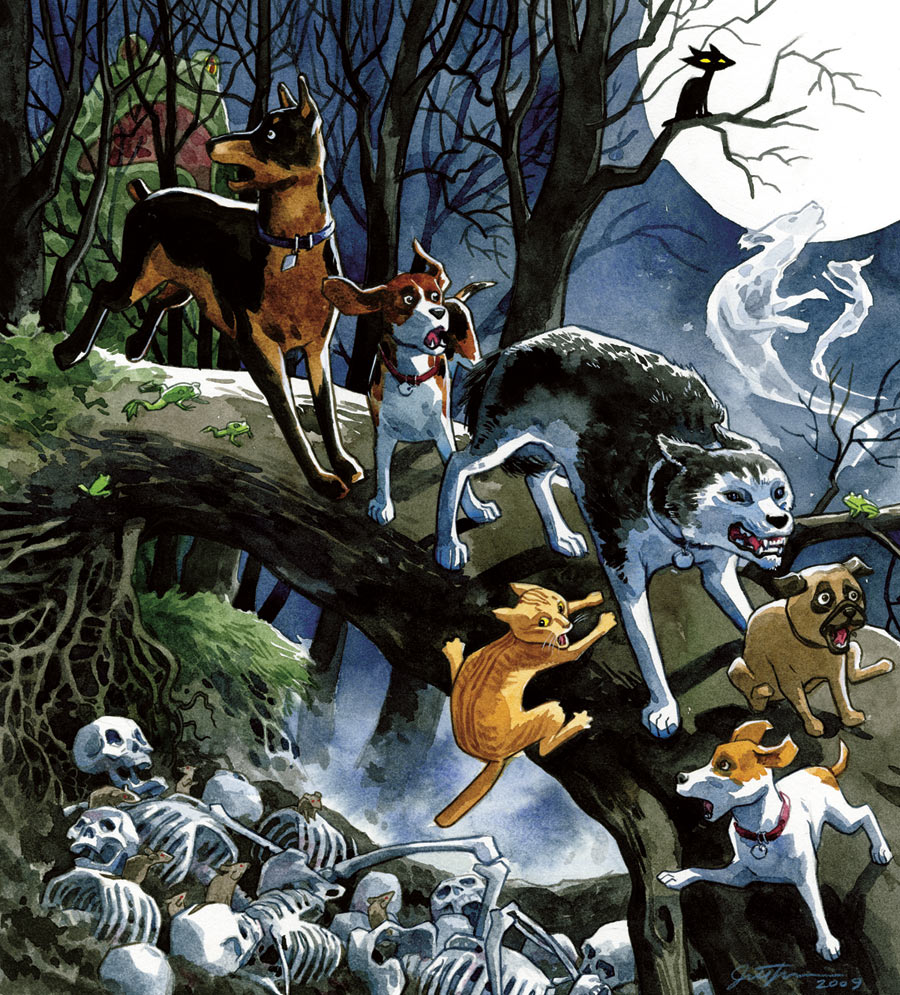 Las criaturas que atacarán a nuestros estimados protagonistas serán de lo más variopintas, habrá un aquelarre de brujas, un grupo de perros zombis invocados por un gato negro, una superrana gigante poseída por los demonios y humanos fanáticos de la magia negra y el esoterismo. Cuando se publicó por primera vez esta obra causó un enorme revuelo, tanto por sus exquisitos dibujos como por su argumento rompedor. En este cómic veréis como los perros y los gatos pueden tener más humanidad que las personas. Una obra maestra.