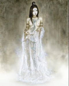 Me interesaba combinar Oriente y Occidente, pero no solo adaptando por un lado un tema y por el otro un estilo. Está claro que el dibujo es occidental y el tema oriental, pero también hay pequeños toques artísticos propios de Oriente, en aspectos como la representación espacial del vacío, las figuras muy recortadas en el paisaje, todo muy etéreo, los tonos apagados de color (sin claroscuros, como se hace en Occidente, etc.).