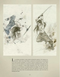 Por otra parte, a la hora de plantear Dead Moon me di cuenta de que podía aportar algo más al proyecto: en lugar de hacer una obra con una sola técnica común, como se suele hacer en un libro ilustrado en el que las imágenes se refieren a una misma historia, podía darle una estética diferente a cada ilustración, decidiendo qué técnica iría mejor para representar cada momento. Tomé esa decisión, pedí la colaboración de Rómulo Royo para añadir su personalidad mas conceptual, y la experiencia fue muy interesante, porque podíamos hacer una imagen de 1,5m x 1,5m, otra de 1m x 1m, otra de 30cm x 30cm… y también en cuanto a las técnicas: una imagen se trabajaba a grafito, otra a óleo, técnicas mixtas… todo al servicio de la obra y su papel en el libro.