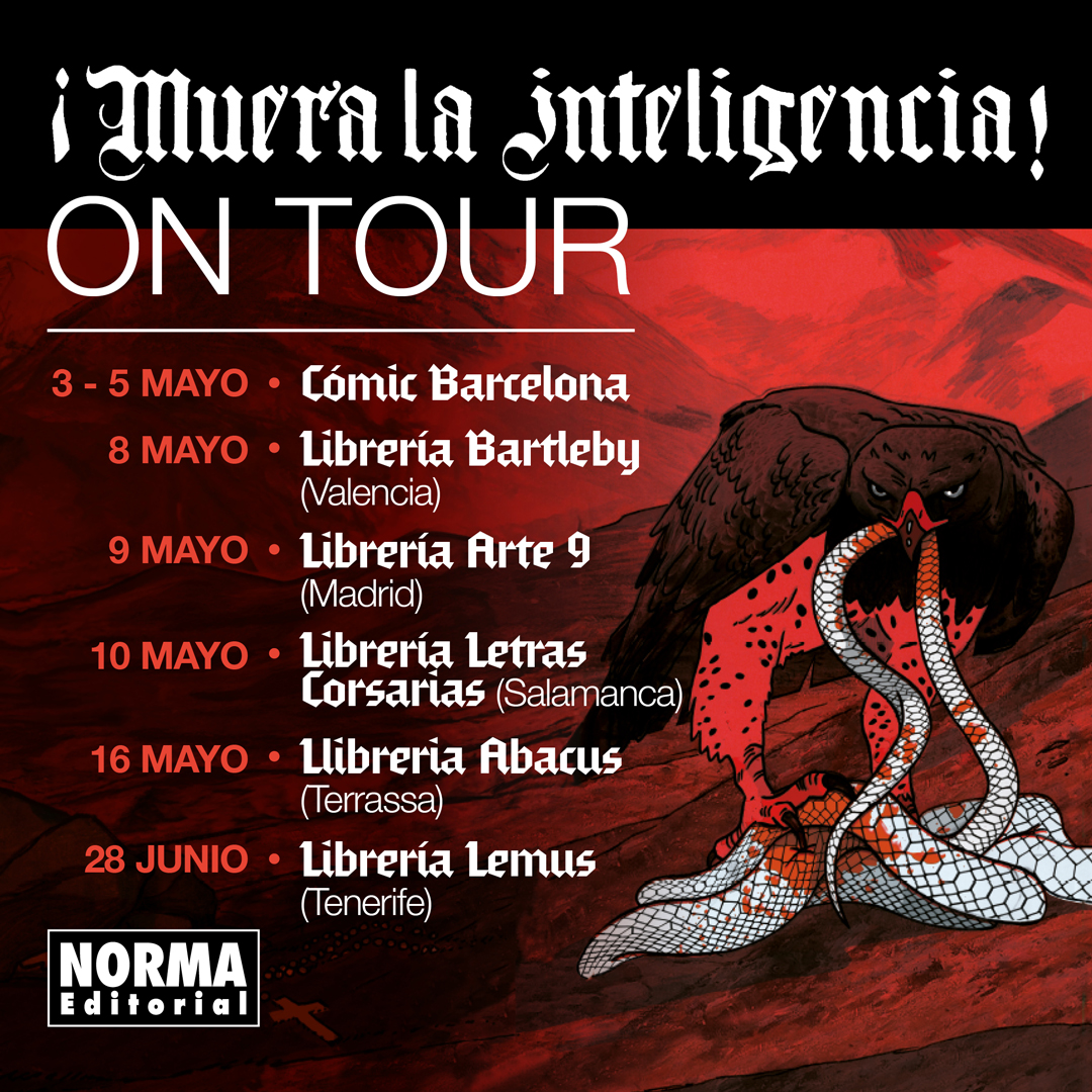El tándem formado por el guionista Jorge García y el dibujante Gustavo Rico, que ya nos sorprendieron con Los dientes de la eternidad y Myrddin, están de vuelta con su nueva obra ¡Muera la inteligencia!, una cómic impactante que relata la de vida de Millán Astray, fundador de La Legión. Para celebrar su lanzamiento los autores van a realizar una ruta por España donde habrá presentaciones y sesiones de firmas del cómic. Tenéis toda la información en la imagen.