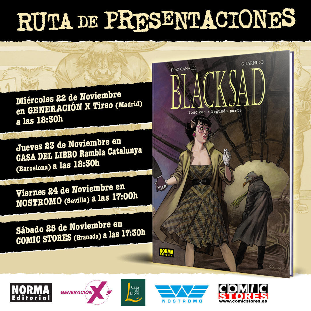 ¡BLACKSAD regresa a librerías este mes con Blacksad 7. Todo cae Parte 2! Y eso significa que también es hora de dar inicio a su ruta de presentaciones. Juan Díaz Canales y Juanjo Guarnido se lanzan a la carretera para asistir a distintas presentaciones en Madrid, Barcelona, Sevilla y Granada. A saber:
