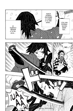 NUNCA PODRÁS A PROTEGER NI CURAR A TU HER- MANA... CON UNA DETERMI- NI NACIÓN ENDE- TAMPOCO A A TU FA- BLE... VENGAR MILIA... ¡NO...! CHAC ¡U A A A A H! KIMETSU NO YAIBA © Koyoharu Gotouge / SHUEISHA Inc.