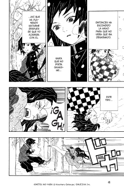 ...ASÍ QUE HA PLA- NEADO ENTONCES HA MATARME ESCONDIDO DESPUÉS LA MANO DE QUE YO PARA QUE NO ACABARA VIERA QUE IBA CON ÉL. DESARMADO. SABÍA QUE NO PODÍA GANAR- ME... ESTE TIPO... ¡G A G H! BLAM 48 KIMETSU NO YAIBA © Koyoharu Gotouge / SHUEISHA Inc.