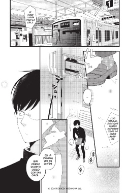 El TIRURÍ tren lega por la vía 2. PSHH ... Los pasaje- ros que suban esperen tras la línea blan- ca. p Es la a f primera p que vez en a f charlo la vida un rato largo p a con una f chica... © 2016 ROBICO/ KODANSHA Ltd.