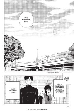 Olía bastante bien. * * Estación de Heiwadai Al día siguien- te crucé miradas con Aizawa en el Decidí instituto, olvidarlo pero desvia- todo. ba la vista. 24 © 2016 ROBICO/ KODANSHA Ltd.
