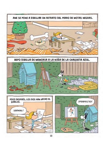 BEPO DIBUJA DE MEMORIA A LA NI%u00d1A DE LA CHAQUETA AZUL.134%u00a1GENIAL!%u00a1PERFECTO!ANE SE PONE A DIBUJAR UN RETRATO DEL PERRO DE MOTAS NEGRAS.BEPO DIBUJA DE MEMORIA A LA NI%u00d1A DE LA CHAQUETA AZUL.POCO DESPU%u00c9S, LOS DOS HAN HECHO EL DIBUJO. 13TRIPA DOS REGALOS.indd 13 6/8/24 12:04