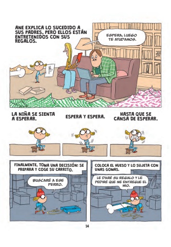 ESPERA, LUEGO TE AYUDAMOS.BUSCAR%u00c9 A ESE PERRO.LE DAR%u00c9 SU REGALO Y LE PEDIR%u00c9 QUE ME ENTREGUE EL M%u00cdO.ANE EXPLICA LO SUCEDIDO A SUS PADRES, PERO ELLOS EST%u00c1N ENTRETENIDOS CON SUS REGALOS.LA NI%u00d1A SE SIENTA A ESPERAR. ESPERA Y ESPERA. HASTA QUE SE CANSA DE ESPERAR. FINALMENTE, TOMA UNA DECISI%u00d3N: SE PREPARA Y COGE SU CARRITO.COLOCA EL HUESO Y LO SUJETA CON UNAS GOMAS.14 TRIPA DOS REGALOS.indd 14 6/8/24 12:0414