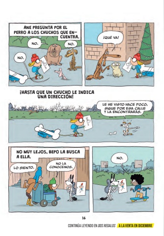 NO.NO. NO.%u00a1QU%u00c9 VA! LE HE VISTO HACE POCO, SIGUE POR ESA CALLE Y LA ENCONTRAR%u00c1S.LO SIENTO.NO LA CONOCEMOS.ANE PREGUNTA POR EL PERRO A LOS CHUCHOS QUE EN- CUENTRA. %u00a1HASTA QUE UN CHUCHO LE INDICA UNA DIRECCI%u00d3N!NO MUY LEJOS, BEPO LA BUSCA A ELLA.16 NO.TRIPA DOS REGALOS.indd 16 6/8/24 12:0CONTIN%u00daA LEYENDO EN DOS REGALOS A LA VENTA EN DICIEMBRE