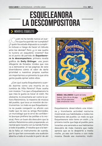 1704%u00bfQui%u00e9n no ha tenido nunca un sue%u00f1o que ha querido ver cumplido? %u00bfY qui%u00e9n ha estado dispuesto a cumplirlo incluso a riesgo de hacer el rid%u00edculo ante los dem%u00e1s? Pero %u00bfy si ese sue%u00f1o lo tuviera un esqueleto viviente? Ese es el punto de partida de Esqueleanora la descompositora, primera novela gr%u00e1fica de Emily Ettlinger, una joven dibujante de Estados Unidos que nos va a demostrar en las p%u00e1ginas de este divertid%u00edsimo c%u00f3mic el valor de darle prioridad a nuestros propios sue%u00f1os sin importarnos un pimiento lo que otra gente pueda opinar sobre ellos.%u00bfCon qu%u00e9 sue%u00f1a Esqueleanora cuando duerme como una muerta en su tumbita de Villa F%u00e9retro? Pues sue%u00f1a con m%u00fasica. Y es que a Esqueleanora lo que m%u00e1s le gusta es tocar el viol%u00edn. No obstante, le encantar%u00eda ser como la se%u00f1ora Ratsimiziva, la maestra de m%u00fasica del pueblo, que toca un mont%u00f3n de instrumentos. Lo malo es que Esqueleanora no puede compartir su afici%u00f3n con nadie que no sea su amiga Murciedes, un murci%u00e9lago que le sirve de confidente (aunque prefiera las polillas a la m%u00fasica). Pero un buen d%u00eda descubre que la se%u00f1ora Ratsimiziva est%u00e1 preparando un recital para tocarlo con su banda frente a todo el pueblo. %u00a1Y resulta que a la banda le falta un instrumento de cuerda, por lo que han convocado una audici%u00f3n abierta a todo el mundo! A partir de ah%u00ed M%u00daSICA / HALLOWEEN %u2022 A partir de 6 a%u00f1osCarton%u00e9. 18,6 x 24 cm. 64 p%u00e1gs. Color. PVP por determinarISBN: 978-84-679-7144-6%u00a9 2023, Emily Ettlinger. Translation rights arranged by Copps Literary Services LLC and IMC Agencia Literaria S.LEMILY ETTLINGERA LA VENTA EN OCTUBRE%u203a MOVER EL ESQUELETOEsqueleanora desarrollar%u00e1 una intensa y tronchante actividad nocturna mostrando sus habilidades a todos los habitantes del pueblo. Lo malo es que Esqueleanora solo tiene un viol%u00edn, y la primera noche que baja al pueblo para tocarles una serenata a sus habitantes descubre de mala manera que nadie aprecia que se lo despierte a media noche, ya sea con buena o con mala m%u00fasica. Desde ese momento, multiESQUELEANORA LA DESCOMPOSITORADESCUBRE + ASTRONAVE - OTO%u00d1O 2024 P%u00c1G. 107 //