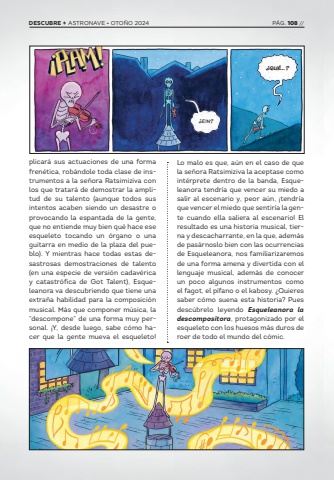 plicar%u00e1 sus actuaciones de una forma fren%u00e9tica, rob%u00e1ndole toda clase de instrumentos a la se%u00f1ora Ratsimiziva con los que tratar%u00e1 de demostrar la amplitud de su talento (aunque todos sus intentos acaben siendo un desastre o provocando la espantada de la gente, que no entiende muy bien qu%u00e9 hace ese esqueleto tocando un %u00f3rgano o una guitarra en medio de la plaza del pueblo). Y mientras hace todas estas desastrosas demostraciones de talento (en una especie de versi%u00f3n cadav%u00e9rica y catastr%u00f3fica de Got Talent), Esqueleanora va descubriendo que tiene una extra%u00f1a habilidad para la composici%u00f3n musical. M%u00e1s que componer m%u00fasica, la %u201cdescompone%u201d de una forma muy personal. %u00a1Y, desde luego, sabe c%u00f3mo hacer que la gente mueva el esqueleto! Lo malo es que, a%u00fan en el caso de que la se%u00f1ora Ratsimiziva la aceptase como int%u00e9rprete dentro de la banda, Esqueleanora tendr%u00eda que vencer su miedo a salir al escenario y, peor a%u00fan, %u00a1tendr%u00eda que vencer el miedo que sentir%u00eda la gente cuando ella saliera al escenario! El resultado es una historia musical, tierna y descacharrante, en la que, adem%u00e1s de pas%u00e1rnoslo bien con las ocurrencias de Esqueleanora, nos familiarizaremos de una forma amena y divertida con el lenguaje musical, adem%u00e1s de conocer un poco algunos instrumentos como el fagot, el p%u00edfano o el kabosy. %u00bfQuieres saber c%u00f3mo suena esta historia? Pues desc%u00fabrelo leyendo Esqueleanora la descompositora, protagonizado por el esqueleto con los huesos m%u00e1s duros de roer de todo el mundo del c%u00f3mic.%u00a1ALL%u00c1 VOY!11%u00bfEIN?%u00bfQU%u00c9%u2026?%u00bfQU%u00c9 TE PASA, ESQUELEANORA? LOS DE LA BANDA DEL PUEBLO DIJERON QUE NECESITABAN UN M%u00daSICO DE CUERDA PARA TOCAR EN EL FESTIVAL...PERO CUANDO HE INTENTADO LLAMAR SU ATENCI%u00d3N TOCANDO EL VIOL%u00cdN EN LA PLAZA, %u00a1TODO EL MUNDO HA CERRADO LAS VENTANAS! ESQUELEANORA, ESTAMOS EN PLENA NOCHE%u2026%u00bfAHORAMISMO?%u00bfY%u2026?CREO QUE S%u00c9 LO QUE HA FALLADO. MURCIEDEEESSS...DESCUBRE + ASTRONAVE - OTO%u00d1O 2024 P%u00c1G. 108 //
