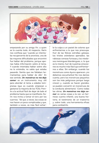 empezando por su amiga Viv, a quien se lo cuenta todo. Al respecto, Karin nos confiesa que %u201ccuando yo intentaba recuperarme de la anorexia, una de las mayores dificultades que encontr%u00e9 fue hablar del problema, porque apenas hab%u00eda informaci%u00f3n sobre el tema. Y cuando intentaba hablar sobre ello no lo entend%u00eda, no sab%u00eda qu%u00e9 estaba pasando. Sent%u00eda que me faltaban herramientas para hablar de ello%u201d. En ese sentido, Un monstruo no me deja comer es un instrumento muy %u00fatil para abordar el tema a edades tempranas (que es cuando empiezan a gestarse la mayor%u00eda de los TCA). Frente a la actitud f%u00e1cil de dejar de lado el problema hasta que se manifieste, Karin nos invita a tomar el toro por los cuernos. %u201cS%u00e9 que, a veces, las cosas se nos hacen un poco complicadas y que, tambi%u00e9n a veces, es m%u00e1s f%u00e1cil echarle la culpa a un pastel de colores que enfrentarnos a lo que nos preocupa. Huir de las felices estrellas golosas, los tristes ar%u00e1ndanos apenados, las rabiosas cerezas furiosas y los miedosos merengues blandengues, o, lo que es lo mismo, huir de nuestras emociones es mucho m%u00e1s f%u00e1cil que enfrentarnos a ellas. Sin embargo, cuando los monstruos como Ayuno aparecen, %u00a1no debemos escucharlos! No nos damos cuenta, pero los monstruos peque%u00f1os son los m%u00e1s peligrosos porque luego crecen y, cuando se hacen grandes, se pueden convertir en monstruos de la conducta alimentaria%u201d. Como todas las obras, Un monstruo me deja comer es varias cosas a la vez: un hermoso cuento infantil, una buena historia, el testimonio de un trastorno y, sobre todo, una herramienta eficaz para combatirlo.DESCUBRE + ASTRONAVE - OTO%u00d1O 2024 P%u00c1G. 122 //