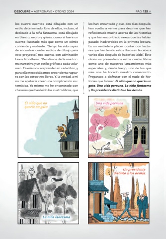 los cuatro cuentos est%u00e1 dibujado con un estilo determinado. Uno de ellos, incluso, el dedicado a la ni%u00f1a fantasma, est%u00e1 dibujado en blanco, negro y grises, como si fuera un cuento ilustrado m%u00e1s que como un c%u00f3mic corriente y moliente. %u201cSergio ha sido capaz de encontrar cuatro estilos de dibujo para este proyecto%u201d, nos cuenta con admiraci%u00f3n Lewis Trondheim. %u201cDecidimos darle una forma narrativa y un estilo gr%u00e1fico a cada volumen. Quer%u00edamos sorprender en cada libro, y para ello necesit%u00e1bamos crear cierta ruptura con los otros tres libros. Y, la verdad, a m%u00ed no me apetec%u00eda crear una complicaci%u00f3n sistem%u00e1tica. Yo mismo me he encontrado con chavales que han le%u00eddo los cuatro libros, que les han encantado y que, dos d%u00edas despu%u00e9s, han vuelto a verme para decirme que han reflexionado mucho acerca de las historias y que han encontrado nexos que les hab%u00edan pasado inadvertidos en la primera lectura. Es un verdadero placer contar con lectores que han tenido estos libros en la cabeza varios d%u00edas despu%u00e9s de haberlos le%u00eddo%u201d. Este oto%u00f1o os presentamos estos cuatro libros como uno de nuestros lanzamientos m%u00e1s especiales y, desde luego, uno de los que m%u00e1s nos ha tocado nuestro corazoncito. Preparaos a disfrutar con el nudo de historias que forman El ni%u00f1o que no quer%u00eda un gato, Una vida perruna, La ni%u00f1a fantasmay Un presidente distinto a los dem%u00e1s. DESCUBRE + ASTRONAVE - OTO%u00d1O 2024 P%u00c1G. 125 //