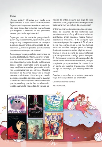 %u00a1Hola!%u00bfC%u00f3mo est%u00e1s? %u00a1Gracias por darle una oportunidad a esta revista tan especial! Espero que lo que contiene te abra el apetito para todas las historias maravillosas que llegar%u00e1n a librer%u00edas en los pr%u00f3ximos meses. %u00a1No te decepcionar%u00e1n!Supongo que te estar%u00e1s preguntando qui%u00e9n soy exactamente, qui%u00e9n hablo. %u00a1Qu%u00e9 alegr%u00eda! Soy la representante de la tripulaci%u00f3n de la Astronave, %u00a1encantada de conocerte! %u00bfC%u00f3mo es posible que hayamos pasado tanto tiempo sin hablar?Como seguro que ya sabr%u00e1s, Astronave es el sello de literatura infantil, juvenil y crossover de Norma Editorial. Somos un sello con identidad propia donde publicamos desde libros ilustrados para peques (y mayores) hasta novelas, pero sobre todo nos especializamos en c%u00f3mics. Nuestra intenci%u00f3n es haceros llegar de la mejor manera posible esas historias que cuando las lees se quedan contigo, que te ayudan cuando no sab%u00edas qu%u00e9 era exactamente lo que te pasaba y que te dan un abrazo invisible cuando lo necesitas. Si ya nos conoc%u00edas de antes, seguro que algo de esto te suena; si no, %u00a1espero que lo tengas todo listo para vivir un mill%u00f3n de emociones!Entre tus manos tienes una selecci%u00f3n cuidada de algunas de las historias que vendr%u00e1n este oto%u00f1o y el futuro invierno: aventuras, amor, regalos, magia, humor, esperanza, misterio... Y te aseguro que traemos algo perfecto para ti. S%u00ed, s%u00ed, para ti: no nos conocemos, o no nos hemos visto en mucho tiempo, pero no tengo dudas de que entre estas p%u00e1ginas encontrar%u00e1s el inicio de una de esas historias que se quedar%u00e1n contigo para siempre. En Astronave tenemos el superpoder de saber c%u00f3mo tocar la fibra sensible, as%u00ed que prep%u00e1rate, porque acabas de convertirte en parte de nuestra tripulaci%u00f3n. %u00a1%u00c9chale un ojo al cat%u00e1logo, que despegamos en nada!Gracias por confiar en nosotros para este viaje. Ser%u00e1 agradable, %u00a1lo prometo!Con much%u00edsimo cari%u00f1o,ASTRONAVE.