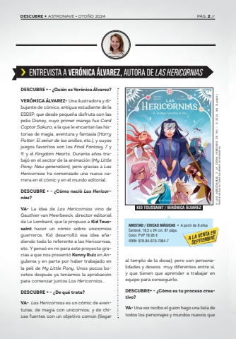 DESCUBRE + - %u00bfQui%u00e9n es Ver%u00f3nica %u00c1lvarez?VER%u00d3NICA %u00c1LVAREZ- Una ilustradora y dibujante de c%u00f3mics, antigua estudiante de la ESDIP, que desde peque%u00f1a disfruta con las pelis Disney, cuyo primer manga fue Card Captor Sakura, a la que le encantan las historias de magia, aventura y fantas%u00eda (Harry Potter, El se%u00f1or de los anillos, etc.), y cuyos juegos favoritos son los Final Fantasy 7 y 9, y el Kingdom Hearts. Durante a%u00f1os trabaj%u00f3 en el sector de la animaci%u00f3n (My Little Pony: New generation), pero gracias a Las Hericornias ha comenzado una nueva carrera en el c%u00f3mic y en el mundo editorial.DESCUBRE + - %u00bfC%u00f3mo naci%u00f3 Las Hericornias?VA- La idea de Las Hericornias vino de Gauthier van Meerbeeck, director editorial de Le Lombard, que le propuso a Kid Toussaint hacer un c%u00f3mic sobre unicornios guerreros. Kid desarroll%u00f3 esa idea a%u00f1adiendo todo lo referente a las Hericornias, etc. Y pens%u00f3 en m%u00ed para este proyecto gracias a que nos present%u00f3 Kenny Ruiz en Angulema y en parte por haber trabajado en la peli de My Little Pony. Unos pocos bocetos despu%u00e9s ya ten%u00edamos la aprobaci%u00f3n para comenzar juntos Las Hericornias%u2026 DESCUBRE + - %u00bfDe qu%u00e9 trata?VA- Las Hericornias es un c%u00f3mic de aventuras, de magia con unicornios, y de chicas fuertes con un objetivo com%u00fan (llegar %u203a ENTREVISTA A VER%u00d3NICA %u00c1LVAREZ, AUTORA DE LAS HERICORNIASal templo de la diosa), pero con personalidades y deseos muy diferentes entre s%u00ed, y que tienen que aprender a trabajar en equipo para conseguirlo. DESCUBRE+ - %u00bfC%u00f3mo es tu proceso creativo?VA- Una vez recibo el guion hago una lista de todos los personajes y mundos nuevos que AMISTAD / CHICAS M%u00c1GICAS %u2022 A partir de 8 a%u00f1osCarton%u00e9. 18,5 x 24 cm. 87 p%u00e1gs. Color. PVP 18,95 %u20acISBN: 978-84-679-7064-7%u00a9 LAS HERICORNIAS 2: LA DIGNA HEREDERA DE MU - %u00a9 2024, Kid Toussaint, Ver%u00f3nica %u00c1lvarez. Todos los derechos reservados.KID TOUSSAINT / VER%u00d3NICA %u00c1LVAREZA LA VENTA EN SEPTIEMBREDESCUBRE + ASTRONAVE - OTO%u00d1O 2024 P%u00c1G. 2 //