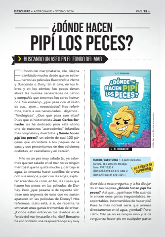2326El fondo del mar (matarile, rile, rile) ha cambiado mucho desde que se estrenaron las pel%u00edculas Buscando a Nemo y Buscando a Dory. En el cine, en los libros y en los c%u00f3mics, los peces tienen ahora las mismas necesidades de cari%u00f1o y compa%u00f1%u00eda que tenemos los seres humanos. Sin embargo, %u00bfqu%u00e9 pasa con el resto de sus... ejem... necesidades? Nos referimos, claro, a sus necesidades... digamos... %u201cfisiol%u00f3gicas%u201d. %u00bfQue qu%u00e9 pasa con ellas? Pues que el historietista Juan Carlos Bonache les ha dedicado para este oto%u00f1o uno de nuestros %u201castroc%u00f3mics%u201d infantiles m%u00e1s originales y divertidos: %u00bfD%u00f3nde hacen pip%u00ed los peces?, un c%u00f3mic de casi 100 p%u00e1ginas que encantar%u00e1 a los peques de la casa y que presentamos en dos ediciones distintas, en castellano y en catal%u00e1n.Milo es un pez muy salado (s%u00ed, ya sabemos que ser salado en el mar no es ning%u00fan m%u00e9rito) al que le gusta mucho jugar bajo el agua. Le encanta hacer castillos de arena con sus amigos, jugar con las algas, explorar arrecifes de coral, en fin, las cosas que hacen los peces en las pel%u00edculas de Disney. Pero %u00bfqu%u00e9 pasar%u00eda si de repente sintiese una urgencia de esas que no suelen aparecer en las pel%u00edculas de Disney? Nos referimos, claro est%u00e1, a si, de repente, le entraran unas ganas tremendas de orinar. %u00bfD%u00f3nde est%u00e1n entonces los lavabos en el fondo del mar (matarile, rile, rile)? Bonache ha encontrado una respuesta l%u00f3gica y muy HUMOR / AVENTURAS %u2022 A partir de 6 a%u00f1osCarton%u00e9. 16 x 20,5 cm. 96 p%u00e1gs. Color. PVP 18,95 %u20acISBN CAST: 978-84-679-7063-0ISBN CAT: 978-84-679-7204-7%u00a9 2024, Bonache. Tots els drets reservats.J. C. BONACHEA LA VENTA EN SEPTIEMBRE%u203a BUSCANDO UN ASEO EN EL FONDO DEL MARdivertida a esta pregunta, y la ha dibujado en las p%u00e1ginas %u00bfD%u00f3nde hacen pip%u00ed los peces?. As%u00ed que... %u00bfqu%u00e9 hace Milo cuando le entran unas ganas inaguantables, insoportables, incontenibles de hacer pis? Pues lo m%u00e1s normal ser%u00eda que orinase directamente en el agua, %u00bfverdad? Pero, claro, Milo ya no es ning%u00fan ni%u00f1o y le da verg%u00fcenza hacer pis en cualquier parte, %u00bfD%u00d3NDE HACENPIP%u00cd LOS PECES?DESCUBRE + ASTRONAVE - OTO%u00d1O 2024 P%u00c1G. 39 //