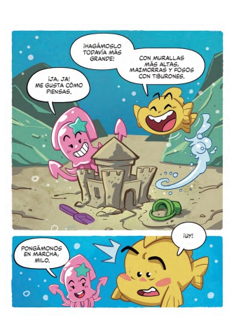%u00a1Hag%u00e1moslo todav%u00eda m%u00e1s grande! Con murallas m%u00e1s altas, mazmorras y fososcon tiburones. %u00a1Ja, ja! Me gusta c%u00f3mo piensas.Pong%u00e1monos en marcha, Milo.%u00a1Uy!TRIPA_DONDE HACEN PIPI LOS PECES coed CASTELLANO 160x205.indd 6 5/7/24 13:03