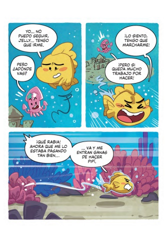 Yo... no puedo seguir, Jelly... Tengo que irme.%u00a1Lo siento, tengo que marcharme!Pero %u00bfAd%u00d3NDEvas?%u00a1Pero si queda mucho trabajo por hacer!%u00a1Qu%u00e9 rabia! Ahora que me lo estaba pasando tan bien%u2026... va y me entran ganas de hacer pip%u00ed.TRIPA_DONDE HACEN PIPI LOS PECES coed CASTELLANO 160x205.indd 8 5/7/24 13:03