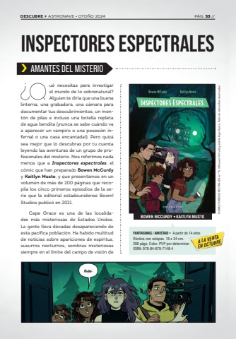 %u00bfQu%u00e9 necesitas para investigar el mundo de lo sobrenatural? Alguien te dir%u00eda que una buena linterna, una grabadora, una c%u00e1mara para documentar tus descubrimientos, un mont%u00f3n de pilas e incluso una botella repleta de agua bendita (%u00a1nunca se sabe cu%u00e1ndo va a aparecer un vampiro o una posesi%u00f3n infernal o una casa encantada!). Pero quiz%u00e1 sea mejor que lo descubras por tu cuenta leyendo las aventuras de un grupo de profesionales del misterio. Nos referimos nada menos que a Inspectores espectrales, el c%u00f3mic que han preparado Bowen McCurdyy Kaitlyn Musto, y que presentamos en un volumen de m%u00e1s de 200 p%u00e1ginas que recopila los cinco primeros episodios de la serie que la editorial estadounidense Boom! Studios public%u00f3 en 2021.Cape Grace es una de las localidades m%u00e1s misteriosas de Estados Unidos. La gente lleva d%u00e9cadas desapareciendo de esta pac%u00edfica poblaci%u00f3n. Ha habido multitud de noticias sobre apariciones de esp%u00edritus, susurros nocturnos, sombras misteriosas siempre en el l%u00edmite del campo de visi%u00f3n de FANTASMAS / AMISTAD %u2022 A partir de 14 a%u00f1osR%u00fastica con solapas. 16 x 24 cm.208 p%u00e1gs. Color. PVP por determinarISBN: 978-84-679-7148-4INSPECTORES ESPECTRALES es %u2122 & %u00a9 Bowen McCurdy and Kaitlyn Musto. Todos los derechos reservados.BOWEN MCCURDY %u2022 KAITLYN MUSTOA LA VENTA EN OCTUBRE%u203a AMANTES DEL MISTERIOINSPECTORES ESPECTRALESDESCUBRE + ASTRONAVE - OTO%u00d1O 2024 P%u00c1G. 53 //