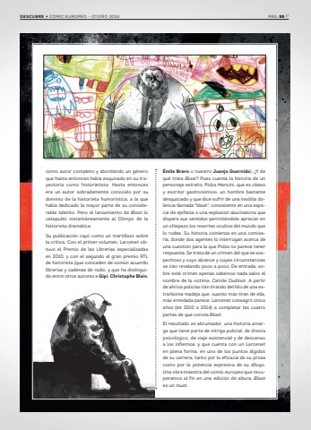 como autor completo y abordando un g%u00e9nero que hasta entonces hab%u00eda esquivado en su trayectoria como historietista. Hasta entonces era un autor sobradamente conocido por su dominio de la historieta humor%u00edstica, a la que hab%u00eda dedicado la mayor parte de su considerable talento. Pero el lanzamiento de Blast lo catapult%u00f3 instant%u00e1neamente al Olimpo de la historieta dram%u00e1tica. Su publicaci%u00f3n cay%u00f3 como un martillazo sobre la cr%u00edtica. Con el primer volumen, Larcenet obtuvo el Premio de las Librer%u00edas especializadas en 2010, y con el segundo el gran premio RTL de historieta (que conceden de com%u00fan acuerdo librer%u00edas y cadenas de radio, y que ha distinguido entre otros autores a Gipi, Christophe Blain, %u00c9mile Bravo o nuestro Juanjo Guarnido). %u00bfY de qu%u00e9 trata Blast? Pues cuenta la historia de un personaje extra%u00f1o, Polza Mancini, que es obeso y escritor gastron%u00f3mico, un hombre bastante desquiciado y que dice sufrir de una ins%u00f3lita dolencia llamada \cie de epifan%u00eda o una explosi%u00f3n alucinatoria que dispara sus sentidos permiti%u00e9ndole apreciar en un chispazo los resortes ocultos del mundo que lo rodea. Su historia comienza en una comisar%u00eda, donde dos agentes lo interrogan acerca de una cuesti%u00f3n para la que Polza no parece tener respuesta. Se trata de un crimen del que es sospechoso y cuyo alcance y cuyas circunstancias se ir%u00e1n revelando poco a poco. De entrada, sobre este crimen apenas sabemos nada salvo el nombre de la v%u00edctima: Carole Oudinot. A partir de ah%u00ed los polic%u00edas ir%u00e1n tirando del hilo de una extra%u00f1%u00edsima madeja que, cuanto m%u00e1s tiran de ella, m%u00e1s enredada parece. Larcenet consagr%u00f3 cinco a%u00f1os (de 2010 a 2014) a completar las cuatro partes de que consta Blast. El resultado es abrumador, una historia amarga que tiene parte de intriga policial, de drama psicol%u00f3gico, de viaje existencial y de descenso a los infiernos, y que cuenta con un Larcenet en plena forma, en uno de los puntos %u00e1lgidos de su carrera, tanto por la eficacia de su prosa como por la potencia expresiva de su dibujo. Una obra maestra del c%u00f3mic europeo que recuperamos al fin en una edici%u00f3n de altura. Blastes un must.DESCUBRE + C%u00d3MIC EUROPEO - OTO%u00d1O 2024 P%u00c1G. 98 //