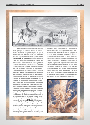 \ de un patrimonio literario com%u00fan, %u00bfpor qu%u00e9 no hacer un trabajo de divulgaci%u00f3n a trav%u00e9s del dibujo con objeto de que la juventud actual pueda acceder a la gran literatura?\Don Quijote de la Mancha. Juntos llevaron a cabo una relectura minuciosa del cl%u00e1sico seleccionando cuidadosamente los fragmentos clave y manteniendo la estructura de viajes que todo el mundo conoce. Uno de los elementos m%u00e1s llamativos del libro (y de los m%u00e1s dif%u00edciles de representar) son las alucinaciones que sufre don Quijote a lo largo de toda su odisea. Los hermanos Brizzi encontraron una soluci%u00f3n muy efectiva: separar la realidad en dos planos. Por un lado estar%u00eda la realidad que vive la mayor%u00eda de personajes, representada en blanco y negro; por otro, estar%u00edan las visiones de don Quijote (incluido, por supuesto, el famos%u00edsimo duelo contra los molinos de viento), alucinaciones representadas en potentes im%u00e1genes a toda p%u00e1gina dibujadas con unos hermosos l%u00e1pices de color. Este contraste de colores y de realidades le da al c%u00f3mic una entidad propia y, al mismo tiempo, les da a los Brizzi una herramienta para plasmar en im%u00e1genes los dos vol%u00famenes de que consta El Quijote. Desde la primera salida de ese \nombre no quiero acordarme\te del ingenioso hidalgo reci%u00e9n recuperada su cordura, este c%u00f3mic es un tour de force narrativo en el que cristaliza lo mejor de dos grandes artistas (y lo mejor de un cl%u00e1sico universal). Por supuesto, don Quijote se echa a los caminos acompa%u00f1ado por su inseparable Sancho Panza, represente del sentido com%u00fan, que poco a poco se ir%u00e1 contagiando del esp%u00edritu ut%u00f3pico y caballeresco de su amo. Se trata, sin duda, de una adaptaci%u00f3n creativa y muy respetuosa. \ que nuestra honestidad nos fuerza a respetar, digamos, el esp%u00edritu del autor, entendiendo que quien dice adaptaci%u00f3n dice un punto de vista subjetivo, y hay opciones que hemos privilegiado. Hay ciertas secuencias que hemos eliminado, pero, pese a todo, creo que en el fondo nuestra principal preocupaci%u00f3n es el respeto al autor original\a prop%u00f3sito de esta magn%u00edfica adaptaci%u00f3n.DESCUBRE + C%u00d3MIC EUROPEO - OTO%u00d1O 2024 P%u00c1G. 100 //