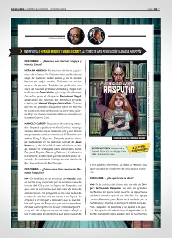 %u203a ENTREVISTA A HERN%u00c1N MIGOYA Y MANOLO CAROT, AUTORES DE UNA REVOLUCI%u00d3N LLAMADA RASPUT%u00cdNDESCUBRE+ - %u00bfQui%u00e9nes son Hern%u00e1n Migoya y Manolo Carot?HERN%u00c1N MIGOYA- Fui escritor de libros y guionista de c%u00f3mics. En Dolmen est%u00e1 publicada mi saga de cuentos Todas putas y en la propia Norma mi mejor novela, Qu%u00edtame tus sucias manos de encima. Tambi%u00e9n he publicado con ellos las novelas gr%u00e1ficas Olimpita y Plagio con el dibujante Joan Mar%u00edn; y la saga de %u00e1lbumes Carvalho para el dibujante Bartolom%u00e9 Segu%u00ed, adaptando las novelas del detective privado creado por Manuel V%u00e1zquez Montalb%u00e1n. Con un porr%u00f3n de grandes dibujantes edit%u00e9 en Norma mi colecci%u00f3n m%u00e1s ambiciosa, la Serie Azul y Serie Roja de Nuevas Haza%u00f1as B%u00e9licas situadas en nuestra Guerra Civil.MANOLO CAROT- Soy autor de comic y tatuador. Empec%u00e9 a publicar en Kiss Comics, hace ya tiempo. Hernan era el redactor jefe y con %u00e9l hice mis primeros comics no er%u00f3ticos: El Hombre con miedo, Kung fu kiyo, etc. Despu%u00e9s pas%u00e9 un tiempo publicando en la editorial Gl%u00e9nat de Joan Navarro, y de ah%u00ed salt%u00e9 al mercado franco-belga, donde he trabajado para editoriales como Dargaud, Dupuis, Gl%u00e8nat y Delcourt. Y todo esto lo combino, desde hace ya m%u00e1s de diez a%u00f1os, tatuando. Actualmente trabajo en una tienda de Barcelona llamada Red Temple.DESCUBRE+ - %u00bfC%u00f3mo nace Una revoluci%u00f3n llamada Rasput%u00edn?HM- En realidad es un encargo de Manolo, que se sent%u00eda muy inspirado por la est%u00e9tica rusa de inicios del XIX y por la figura de Rasput%u00edn, as%u00ed que, con la confianza que dan casi 25 a%u00f1os de colaboraci%u00f3n, me pregunt%u00f3 si me ve%u00eda capaz de construir una historia en torno a su figura. Yo empec%u00e9 a investigar y descubr%u00ed que s%u00ed, que hab%u00eda enfoques de Rasput%u00edn que me interesaban. Al final, sumergirme en el San Petersburgo/Petrogrado de la %u00e9poca supuso el mejor refugio a los tristes d%u00edas de pandemia que pas%u00e9 cuidando a mis padres enfermos. Le debo a Manolo esa oportunidad de evadirme de una %u00e9poca dur%u00edsima.DESCUBRE+ - %u00bfDe qu%u00e9 trata la obra?HM- Es la cr%u00f3nica del %u00faltimo a%u00f1o de vida de Grigori Yef%u00edmovich Rasput%u00edn, un a%u00f1o de grandes conflictos. En plena Gran Guerra, la diplomacia brit%u00e1nica intenta que el zar Nicol%u00e1s los apoye contra Alemania, pero Rusia est%u00e1 asolada por la hambruna y, encima, el consejero %u00edntimo de la zarina, Rasput%u00edn, es pacifista y se opone a la guerra. As%u00ed que la ultraderecha y el espionaje occidental conspiran para acabar con %u00e9l. Contamos %u00a9 Editions Gl%u00e9nat 2023 by Manolo Carot & Hernan Migoya %u2013 ALL RIGHTS RESERVED%u00a9 Johanna Valc%u00e1rcelFICCI%u00d3N HIST%u00d3RICA. Volumen %u00fanicoCarton%u00e9. 23,5 x 31,2 cm. 88 p%u00e1gs. ColorISBN: 978-84-679-7195-8HERN%u00c1N MIGOYA / MANOLO CAROTA LA VENTAEN NOVIEMBREDESCUBRE + C%u00d3MIC EUROPEO - OTO%u00d1O 2024 P%u00c1G. 110 //