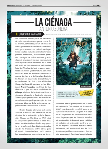 Los pantanos forman parte del decorado de toda fantas%u00eda oscura que se precie. En su interior, sofocados por un laberinto de lianas, perdemos el sentido de la orientaci%u00f3n y tropezamos con toda clase de peligros ocultos, incluidos animales feroces, plantas carn%u00edvoras, civilizaciones perdidas, vestigios de cultos arcanos y toda clase de pruebas de las que nos resultar%u00e1 casi imposible salir indemnes. Es el reino del vud%u00fa, de los monstruos, del hombre lobo, del Wendigo, de todo lo que es putrefacto, tenebroso y sobrenatural. Lo hemos visto en miles de historias adscritas al g%u00e9nero del horror y de Espada y Brujer%u00eda. En Conan, en la pel%u00edcula Cristal Oscuro, en antih%u00e9roes de c%u00f3mic como el Hombre Cosa y la Cosa del pantano, en los dibujos de Frank Frazzetta, en el final de True detective. Y, por supuesto, tambi%u00e9n en La ci%u00e9naga, el c%u00f3mic de fantas%u00eda que firma el cineasta, dibujante e ilustrador Antonio Zurera y que presentamos este oto%u00f1o en un volumen integral que recopila los dos primeros %u00e1lbumes de la serie que se han publicado en Francia hasta la fecha.Reci%u00e9n llegado al mundo del c%u00f3mic, Antonio Zurera es una eminencia en los c%u00edrculos de la animaci%u00f3n y de la ilustraci%u00f3n. Nacido en C%u00f3rdoba en 1957, inici%u00f3 su trayectoria profesional a la edad de 22 a%u00f1os, estableci%u00e9ndose desde muy pronto en la esfera de los dibujos animados, donde ha trabajado, entre otros, para el estudio Hanna-Barbera, nada menos. Los espectadores m%u00e1s veteranos lo recordar%u00e1n por su participaci%u00f3n en la serie de animaci%u00f3n Don Quijote de la Mancha (1981), que desarroll%u00f3 para TVE junto al legendario estudio Cruz Delgado. A lo largo de su trayectoria ha colaborado en multitud largometrajes (en diversos estadios de producci%u00f3n) trabajando para multitud de estudios de animaci%u00f3n dentro y fuera de Espa%u00f1a: Gaumont, Estudios Moro, Mil%u00edmetros, M5 Audiovisual, etc. En 2013 inici%u00f3 una prol%u00edfica carrera como ilustrador y narrador infantil que ha cristalizado %u00a9 DUPUIS 2024, by Zurera. All rights reservedFANTAS%u00cdA. Volumen %u00fanico. Carton%u00e9. 23,5 x 31 cm. Aprox. Aprox. 252 p%u00e1gs. Color. ISBN: 978-84-679-7196-5ANTONIO ZURERAA LA VENTAEN NOVIEMBRELA CI%u00c9NAGAANTONIO ZURERA%u203a COSAS DEL PANTANODESCUBRE + C%u00d3MIC EUROPEO - OTO%u00d1O 2024 P%u00c1G. 123 //