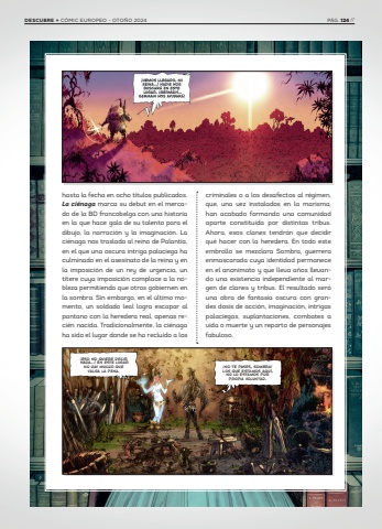 hasta la fecha en ocho t%u00edtulos publicados. La ci%u00e9naga marca su debut en el mercado de la BD francobelga con una historia en la que hace gala de su talento para el dibujo, la narraci%u00f3n y la imaginaci%u00f3n. La ci%u00e9naga nos traslada al reino de Palantia, en el que una oscura intriga palaciega ha culminado en el asesinato de la reina y en la imposici%u00f3n de un rey de urgencia, un t%u00edtere cuya imposici%u00f3n complace a la nobleza permitiendo que otros gobiernen en la sombra. Sin embargo, en el %u00faltimo momento, un soldado leal logra escapar al pantano con la heredera real, apenas reci%u00e9n nacida. Tradicionalmente, la ci%u00e9naga ha sido el lugar donde se ha recluido a los criminales o a los desafectos al r%u00e9gimen, que, una vez instalados en la marisma, han acabado formando una comunidad aparte constituida por distintas tribus. Ahora, esos clanes tendr%u00e1n que decidir qu%u00e9 hacer con la heredera. En todo este embrollo se mezclara Sombra, guerrera enmascarada cuya identidad permanece en el anonimato y que lleva a%u00f1os llevando una existencia independiente al margen de clanes y tribus. El resultado ser%u00e1 una obra de fantas%u00eda oscura con grandes dosis de acci%u00f3n, imaginaci%u00f3n, intrigas palaciegas, suplantaciones, combates a vida o muerte y un reparto de personajes fabuloso.%u00a1No lo dudes! Lo he forjado con un trozo de estrella... Esas piedras caen del cielo, %u00a1no existe un arma igual en esta ci%u00e9naga!%u00bfDe veras?%u00a1Su hoja corta como una navaja y es cien veces m%u00e1s dura que el acero, es la mejor arma que hay en este lodazal!%u00a1Eso no quiere decir nada...! En este lugar no hay mucho que valga la pena.%u00a1No te pases, Sombra! Los que estamos aqu%u00ed, no lo estamos por propia voluntad.%u00a1Yo s%u00ed!%u00a1Alg%u00fan d%u00eda, me gustar%u00eda verte sin esa m%u00e1scara!DESCUBRE + C%u00d3MIC EUROPEO - OTO%u00d1O 2024 P%u00c1G. 124 //