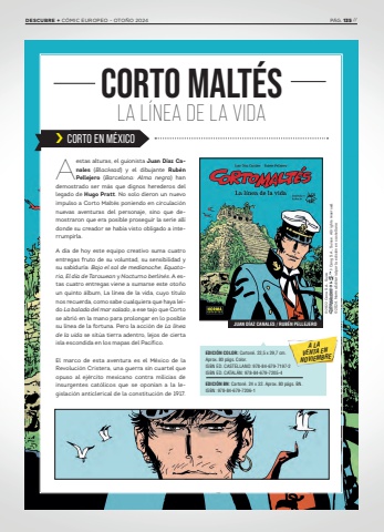 Aestas alturas, el guionista Juan D%u00edaz Canales (Blacksad) y el dibujante Rub%u00e9n Pellejero (Barcelona: Alma negra) han demostrado ser m%u00e1s que dignos herederos del legado de Hugo Pratt. No solo dieron un nuevo impulso a Corto Malt%u00e9s poniendo en circulaci%u00f3n nuevas aventuras del personaje, sino que demostraron que era posible proseguir la serie all%u00ed donde su creador se hab%u00eda visto obligado a interrumpirla. A d%u00eda de hoy este equipo creativo suma cuatro entregas fruto de su voluntad, su sensibilidad y su sabidur%u00eda: Bajo el sol de medianoche, Equatoria, El d%u00eda de Tarowean y Nocturno berlin%u00e9s. A estas cuatro entregas viene a sumarse este oto%u00f1o un quinto %u00e1lbum, La l%u00ednea de la vida, cuyo t%u00edtulo nos recuerda, como sabe cualquiera que haya le%u00eddo La balada del mar salado, a ese tajo que Corto se abri%u00f3 en la mano para prolongar en lo posible su l%u00ednea de la fortuna. Pero la acci%u00f3n de La l%u00ednea de la vida se sit%u00faa tierra adentro, lejos de cierta isla escondida en los mapas del Pac%u00edfico. El marco de esta aventura es el M%u00e9xico de la Revoluci%u00f3n Cristera, una guerra sin cuartel que opuso al ej%u00e9rcito mexicano contra milicias de insurgentes cat%u00f3licos que se opon%u00edan a la legislaci%u00f3n anticlerical de la constituci%u00f3n de 1917. EDICI%u00d3N COLOR: Carton%u00e9. 22,5 x 29,7 cm. Aprox. 80 p%u00e1gs. Color.ISBN ED. CASTELLANO: 978-84-679-7197-2ISBN ED. CATAL%u00c1N: 978-84-679-7205-4EDICI%u00d3N BN: Carton%u00e9. 24 x 32. Aprox. 80 p%u00e1gs. BN.ISBN: 978-84-679-7206-1CORTO MALT%u00c9SJUAN D%u00cdAZ CANALES / RUB%u00c9N PELLEJERO%u203a CORTO EN M%u00c9XICOA LA VENTA EN NOVIEMBRELA L%u00cdNEA DE LA VIDA%u00a9 2022 Cong S.A., Suiza %u00a9 Cong S.A., Suisse. All rights reserved. %u00a9 2024, Norma Editorial por la edici%u00f3n en castellanoDESCUBRE + C%u00d3MIC EUROPEO - OTO%u00d1O 2024 P%u00c1G. 135 //