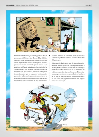 Normalmente Morris y Goscinny part%u00edan de un personaje del folklore del Oeste (Billy el Ni%u00f1o, Calamity Jane, Jesse James) o de un clich%u00e9 mil veces repetido en el cine (el trayecto en diligencia, la ciudad dominada por el miedo a un pistolero, el fuerte sitiado por los indios) y lo convert%u00edan en una especie de mecanismo de relojer%u00eda que, por un lado, se lee a toda prisa deseando saber qu%u00e9 va a pasar a continuaci%u00f3n y, por otro lado, nos impide dejar de re%u00edr ante la acumulaci%u00f3n de elementos c%u00f3micos que se van sucediendo hasta culminar en esa vi%u00f1eta final, siempre id%u00e9ntica a s%u00ed misma, en la que Lucky Luke se aleja hacia el ocaso a lomos de su fiel Jolly Jumper. Estamos, sin duda, ante uno de los mejores tebeos de humor (y uno de los mejores tebeos a secas) jam%u00e1s publicados, con dos de los mejores historietistas del mundo en su momento de m%u00e1ximo esplendor. Juntos firmaron 36 aventuras que presentamos en una edici%u00f3n a la altura de lo que el material exige. %u00bfAlgo que a%u00f1adir? S%u00ed, una cosa m%u00e1s y ya terminamos: \lonesome cowboy\DESCUBRE + C%u00d3MIC EUROPEO - OTO%u00d1O 2024 P%u00c1G. 14 //