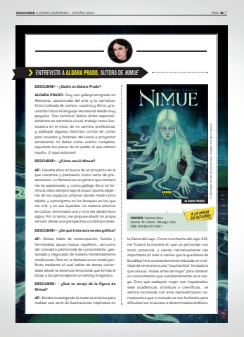 %u203a ENTREVISTA A ALDARA PRADO, AUTORA DE NIMUEDESCUBRE+ - %u00bfQui%u00e9n es Aldara Prado?ALDARA PRADO- Soy una gallega emigrada en Alemania, apasionada del arte y la narrativa. Crec%u00ed rodeada de comics, cuadros y libros, gravitando hacia el lenguaje secuencial desde muy peque%u00f1a. Tras terminar Bellas Artes especializ%u00e1ndome en narrativa visual, trabaj%u00e9 como ilustradora en el inicio de mi carrera profesional, y publiqu%u00e9 algunas historias cortas de comic para revistas y fanzines. Me lanc%u00e9 a proyectar seriamente mi debut como autora completa, siguiendo los pasos de mi padre al que admiro mucho. %u00a1Y aqu%u00ed estamos!DESCUBRE+ - %u00bfC%u00f3mo naci%u00f3 Nimue?AP- Llevaba a%u00f1os en busca de un proyecto en el que volcarme y plantearlo como carta de presentaci%u00f3n. La fantas%u00eda es un g%u00e9nero que siempre me ha apasionado, y, como gallega, llevo mi herencia celta siempre bajo el brazo. Quer%u00eda alejarme de los espacios urbanos donde resid%u00ed como adulta, y sumergirme en los bosques en los que me cri%u00e9, y en sus leyendas. La materia art%u00farica es c%u00edclica, versionada una y otra vez desde hace siglos. Por lo tanto, me propuse a%u00f1adir mi propia versi%u00f3n desde una perspectiva contempor%u00e1nea.DESCUBRE+ - %u00bfDe qu%u00e9 trata esta novela gr%u00e1fica?AP- Nimue habla de emancipaci%u00f3n, familia y hermandad, apoyo mutuo, equilibrio%u2026 as%u00ed como del concepto patrimonial de conocimiento, gestionado y negociado de manera tremendamente condicional. Para m%u00ed, la fantas%u00eda es un medio perfecto mediante el cual hablar de temas universales desde la distancia emocional que brinda el situar a los personajes en un setting imaginario.DESCUBRE+ - %u00bfQu%u00e9 te atrajo de la figura de Nimue?AP- Estaba investigando la materia art%u00farica para realizar una serie de ilustraciones inspiradas en la Dama del Lago. Como muchacha del siglo XXI, me frustr%u00f3 la manera en que un personaje con tanto potencial, y siendo narrativamente tan importante (ni m%u00e1s ni menos que la guardiana de Excalibur) era constantemente reducida en multitud de versiones a una %u201cmuchachita%u201d tentadora que usa sus %u201cmalas artes de mujer%u201d para obtener un conocimiento que constantemente se le niega. Creo que cualquier mujer con inquietudes, sean acad%u00e9micas, art%u00edsticas o cient%u00edficas%u2026 se sentir%u00e1 inc%u00f3moda con esta representaci%u00f3n caricaturesca que a menudo se nos ha hecho para dificultarnos el acceso a determinados %u00e1mbitos. %u00a9 2024, Aldara Prado por el texto y las im%u00e1genes. All rights reservedFANTAS%u00cdA. Volumen %u00fanicoCarton%u00e9. 22 x 29 cm. 128 p%u00e1gs. ColorISBN: 978-84-679-7189-7ALDARA PRADOA LA VENTAEN OCTUBREDESCUBRE + C%u00d3MIC EUROPEO - OTO%u00d1O 2024 P%u00c1G. 15 //