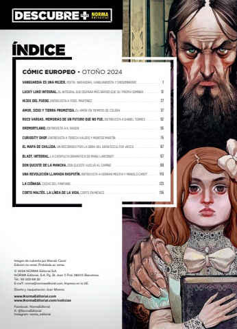 Imagen de cubierta por Manolo CarotEdici%u00f3n no venal. Prohibida su venta.%u00a9 2024 NORMA Editorial S.A. NORMA Editorial, S.A. Pg. St. Joan 7, Pral. 08010 Barcelona.Tel.: 93 303 68 20 E-mail: norma@normaeditorial.com. Impreso en la UE.Dise%u00f1o y maquetaci%u00f3n: Joan Morenowww.NormaEditorial.comwww.NormaEditorial.com/noticiasFacebook: NormaEditorialX: @NormaEditorialInstagram: norma_editorialC%u00d3MIC EUROPEO %u2022 OTO%u00d1O 2024VANGUARDIA ES UNA MUJER. POETA, NADADORA, VANGUARDISTA Y SINSOMBRERO ................ 1 LUCKY LUKE INTEGRAL. EL INTEGRAL QUE DISPARA M%u00c1S R%u00c1PIDO QUE SU PROPIA SOMBRA .......... 12HIJOS DEL FUEGO. ENTREVISTA A FIDEL MART%u00cdNEZ .............................................. 27AMOR, SEXO Y TIERRA PROMETIDA. EL AMOR EN TIEMPOS DE C%u00d3LERA .......................... 37ROCO VARGAS. MEMORIAS DE UN FUTURO QUE NO FUE. ENTREVISTA A DANIEL TORRES ........ 52GREMORYLAND. ENTREVISTA A A. RASEN ...................................................... 55CURIOSITY SHOP. ENTREVISTA A TERESA VALERO Y MONTSE MART%u00cdN ............................. 75 EL MAPA DE CHILLIDA. UN RECORRIDO POR LA OBRA DEL GRAN ESCULTOR VASCO ................ 87BLAST. INTEGRAL. LA CATAPULTA DRAM%u00c1TICA DE MANU LARCENET............................... 97DON QUIJOTE DE LA MANCHA. DON QUIJOTE VUELVE AL CAMINO ................................ 99UNA REVOLUCI%u00d3N LLAMADA RASPUT%u00cdN. ENTREVISTA A HERNAN MIGOYA Y MANOLO CAROT ...... 110 LA CI%u00c9NAGA. COSAS DEL PANTANO ............................................................ 123CORTO MALT%u00c9S. LA L%u00cdNEA DE LA VIDA. CORTO EN M%u00c9XICO .................................... 135