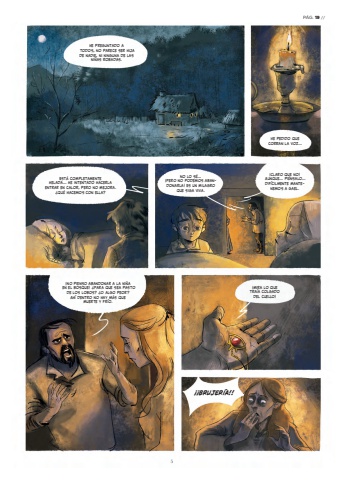 He preguntado a todos, no parece ser hijade nadie, ni ninguna de lasni%u00f1as robadas.Est%u00e1 completamente helada%u2026 he intentado hacerla entrar en calor, pero no mejora. %u00bfQu%u00e9 hacemos con ella?He pedido que corran la voz%u2026No lo s%u00e9%u2026 %u00a1Pero no podemos abandonarla! Es un milagro que siga viva.%u00a1Claro que no! Aunque%u2026 pi%u00e9nsalo%u2026 dif%u00edcilmente mantenemos a Gael.%u00a1Mira lo que tra%u00eda colgado del cuello!%u00a1%u00a1BRUJER%u00edA!!%u00a1No pienso abandonar a la ni%u00f1a en el bosque! %u00bfPara que sea pastode los lobos? %u00bfO algo peor? Ah%u00ed dentro no hay m%u00e1s que muerte y fr%u00edo.5P%u00c1G. 19 //