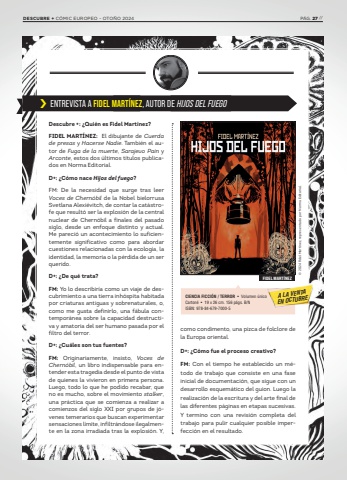 %u203a ENTREVISTA A FIDEL MART%u00cdNEZ, AUTOR DE HIJOS DEL FUEGODescubre +: %u00bfQui%u00e9n es Fidel Mart%u00ednez?FIDEL MART%u00cdNEZ: El dibujante de Cuerda de presas y Hacerse Nadie. Tambi%u00e9n el autor de Fuga de la muerte, Sarajevo Pain y Arconte, estos dos %u00faltimos t%u00edtulos publicados en Norma Editorial.D+: %u00bfC%u00f3mo nace Hijos del fuego?FM: De la necesidad que surge tras leer Voces de Chern%u00f3bil de la Nobel bielorrusa Svetlana Alexi%u00e9vitch, de contar la cat%u00e1strofe que result%u00f3 ser la explosi%u00f3n de la central nuclear de Chern%u00f3bil a finales del pasado siglo, desde un enfoque distinto y actual. Me pareci%u00f3 un acontecimiento lo suficientemente significativo como para abordar cuestiones relacionadas con la ecolog%u00eda, la identidad, la memoria o la p%u00e9rdida de un ser querido.D+: %u00bfDe qu%u00e9 trata?FM: Yo lo describir%u00eda como un viaje de descubrimiento a una tierra inh%u00f3spita habitada por criaturas antiguas y sobrenaturales, o, como me gusta definirlo, una f%u00e1bula contempor%u00e1nea sobre la capacidad destructiva y amatoria del ser humano pasada por el filtro del terror. D+: %u00bfCu%u00e1les son tus fuentes?FM: Originariamente, insisto, Voces de Chern%u00f3bil, un libro indispensable para entender esta tragedia desde el punto de vista de quienes la vivieron en primera persona. Luego, todo lo que he podido recabar, que no es mucho, sobre el movimiento stalker, una pr%u00e1ctica que se comienza a realizar a comienzos del siglo XXI por grupos de j%u00f3venes temerarios que buscan experimentar sensaciones l%u00edmite, infiltr%u00e1ndose ilegalmente en la zona irradiada tras la explosi%u00f3n. Y, como condimento, una pizca de folclore de la Europa oriental.D+: %u00bfC%u00f3mo fue el proceso creativo?FM: Con el tiempo he establecido un m%u00e9todo de trabajo que consiste en una fase inicial de documentaci%u00f3n, que sigue con un desarrollo esquem%u00e1tico del guion. Luego la realizaci%u00f3n de la escritura y del arte final de las diferentes p%u00e1ginas en etapas sucesivas. Y termino con una revisi%u00f3n completa del trabajo para pulir cualquier posible imperfecci%u00f3n en el resultado.CIENCIA FICCI%u00d3N / TERROR %u2022 Volumen %u00fanicoCarton%u00e9 %u2022 19 x 26 cm. 156 p%u00e1gs. B/NISBN: 978-84-679-7000-5FIDEL MART%u00cdNEZ%u00a9 2024 Fidel Mart%u00ednez, representado por Norma Editorial.A LA VENTAEN OCTUBREDESCUBRE + C%u00d3MIC EUROPEO - OTO%u00d1O 2024 P%u00c1G. 27 //