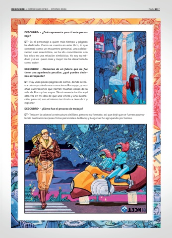 DESCUBRE+ - %u00bfQu%u00e9 representa para ti este personaje?DT- Es el personaje a quien m%u00e1s tiempo y p%u00e1ginas he dedicado. Como se cuenta en este libro, lo que comenz%u00f3 como un encuentro personal, una colaboraci%u00f3n casi anecd%u00f3tica, se ha ido convirtiendo con los a%u00f1os en una relaci%u00f3n simbi%u00f3tica. Yo soy su m%u00e9dium y %u00e9l es quien m%u00e1s y mejor me ha desarrollado como autor.DESCUBRE+ - Memorias de un futuro que no fuetiene una apariencia peculiar, %u00bfqu%u00e9 puedes decirnos al respecto?DT- Hay unas pocas p%u00e1ginas de c%u00f3mic, donde se narra c%u00f3mo y cu%u00e1ndo nos conocimos Roco y yo, y muchas ilustraciones que narran muchas cosas de la vida de Roco y los suyos. T%u00e9cnicamente incido aqu%u00ed otra vez en mi idea de que una vi%u00f1eta y una ilustraci%u00f3n, para m%u00ed, son el mismo territorio a descubrir y explorar. DESCUBRE+ - %u00bfC%u00f3mo fue el proceso de trabajo?DT- Ten%u00eda en la cabeza la estructura del libro, pero no su formato, as%u00ed que dej%u00e9 que se fueran acumulando ilustraciones (esas fotos personales de Roco) y luego las fui agrupando por temas.DESCUBRE + C%u00d3MIC EUROPEO - OTO%u00d1O 2024 P%u00c1G. 53 //