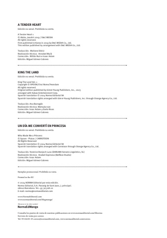 www.NormaEditorial.com www.normaeditorial.com/blogmanga/Consulta los puntos de venta de nuestras publicaciones en www.normaeditorial.com/librerias Servicio de venta por correo: Tel. 93 244 81 25 correo@normaeditorial.com, www.normaeditorial.com/correo.Ejemplar promocional. Prohibida su venta. Printed in the EU%u00a9 2024 NORMA Editorial por esta edici%u00f3n.Norma Editorial, S.A. Passeig de Sant Joan, 7, principal. 08010 Barcelona. Tel.: 93 303 68 20 E-mail: norma@normaeditorial.comKING THE LANDEdici%u00f3n no venal. Prohibida su venta.King The Land Vol. 1Copyright %u00a9 SPOON/Choi Rome/YeondamAll rights reserved.Original edition published by Gimm-Young Publishers, Inc., 2023arranged with Kakao Entertainment Corp.Spanish translation %u00a9 2024 Norma Editorial SASpanish translation rights arranged with Gimm-Young Publishers, Inc. through Orange Agency Co., Ltd.Traducci%u00f3n: Ana Barrag%u00e1nRealizaci%u00f3n t%u00e9cnica: Matsuka-sanCorrecci%u00f3n: Issac Aslam y Dar%u00edo RivasEdici%u00f3n: Miguel G%u00f3mez-CabreroUN D%u00cdA ME CONVERT%u00cd EN PRINCESAEdici%u00f3n no venal. Prohibida su venta.Who Made Me a Princess%u00a9 Spoon %u00b7 Plutus / CARROTOONAll Rights ReservedSpanish translation %u00a9 2024 Norma Editorial SASpanish translation rights arranged with Carrotoon through Orange Agency Co., Ltd.Traducci%u00f3n: Yasmine Bonjoch Luna (DARUMA Serveis Ling%u00fc%u00edstics, SL)Realizaci%u00f3n t%u00e9cnica: Anabel Espinosa (Belflora Studio)Correcci%u00f3n: Issac AslamEdici%u00f3n: Miguel G%u00f3mez-CabreroA TENDER HEARTEdici%u00f3n no venal. Prohibida su venta.A Tender Heart 1%u00a9 Aloha, Jooahri 2019 / D&C MEDIAAll rights reserved.First published in Korea in 2019 by D&C MEDIA Co., Ltd.This edition published by arrangement with D&C MEDIA Co., Ltd.Traducci%u00f3n: Maitane D%u00f3nizRealizaci%u00f3n t%u00e9cnica: Annabel Mul%u00e0Correcci%u00f3n: Mill%u00e1n Ruiz e Isaac AslamEdici%u00f3n: Miguel G%u00f3mez-Cabrero