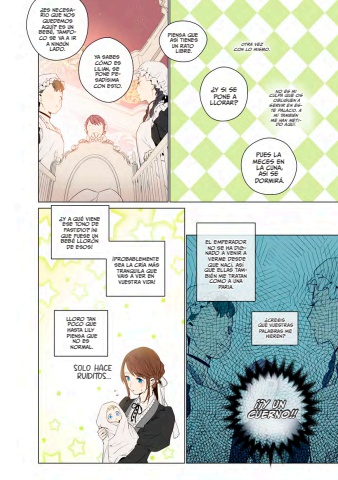 %u00bfEs necesario que nos quedemos aqu%u00ed? Es un beb%u00e9, tampoco se va a ir a ning%u00fan lado.Ya sabes c%u00f3mo es Lilian, se pone pesad%u00edsima con esto.Piensa que as%u00ed tienes un rato libre.%u00bfY si se pone a llorar?Pues la meces en la cuna, as%u00ed se dormir%u00e1.Otra vez con lo mismo.No es mi culpa que os obliguen a servir en este palacio. A m%u00ed tambi%u00e9n me han metido aqu%u00ed.%u00bfY a qu%u00e9 viene ese tono de fastidio? %u00a1Ni que fuese un beb%u00e9 llor%u00f3n de esos!%u00a1Probablemente sea la cr%u00eda m%u00e1s tranquila que vais a ver en vuestra vida!Lloro tan poco que hasta Lily piensa que no es normal.El emperador no se ha dignado a venir a verme desde que nac%u00ed, as%u00ed que ellas tambi%u00e9n me tratan como a una paria.SOLO HACE RUIDITOS...%u00bfCre%u00e9is que vuestras palabras me hieren?%u00a1%u00a1Y un cuerno!!