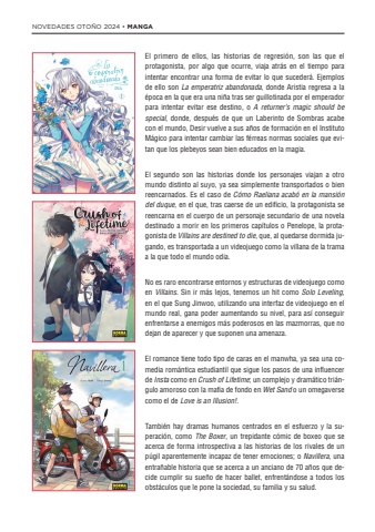 NOVEDADES OTO%u00d1O 2024 %u2022 MANGAEl primero de ellos, las historias de regresi%u00f3n, son las que el protagonista, por algo que ocurre, viaja atr%u00e1s en el tiempo para intentar encontrar una forma de evitar lo que suceder%u00e1. Ejemplos de ello son La emperatriz abandonada, donde Aristia regresa a la %u00e9poca en la que era una ni%u00f1a tras ser guillotinada por el emperador para intentar evitar ese destino, o A returner%u2019s magic should be special, donde, despu%u00e9s de que un Laberinto de Sombras acabe con el mundo, Desir vuelve a sus a%u00f1os de formaci%u00f3n en el Instituto M%u00e1gico para intentar cambiar las f%u00e9rreas normas sociales que evitan que los plebeyos sean bien educados en la magia.El segundo son las historias donde los personajes viajan a otro mundo distinto al suyo, ya sea simplemente transportados o bien reencarnados. Es el caso de C%u00f3mo Raeliana acab%u00f3 en la mansi%u00f3n del duque, en el que, tras caerse de un edificio, la protagonista se reencarna en el cuerpo de un personaje secundario de una novela destinado a morir en los primeros cap%u00edtulos o Penelope, la protagonista de Villains are destined to die, que, al quedarse dormida jugando, es transportada a un videojuego como la villana de la trama a la que todo el mundo odia. No es raro encontrarse entornos y estructuras de videojuego como en Villains. Sin ir m%u00e1s lejos, tenemos un hit como Solo Leveling, en el que Sung Jinwoo, utilizando una interfaz de videojuego en el mundo real, gana poder aumentando su nivel, para as%u00ed conseguir enfrentarse a enemigos m%u00e1s poderosos en las mazmorras, que no dejan de aparecer y que suponen una amenaza.El romance tiene todo tipo de caras en el manwha, ya sea una comedia rom%u00e1ntica estudiantil que sigue los pasos de una influencer de Insta como en Crush of Lifetime; un complejo y dram%u00e1tico tri%u00e1ngulo amoroso con la mafia de fondo en Wet Sand o un omegaverse como el de Love is an Illusion!.Tambi%u00e9n hay dramas humanos centrados en el esfuerzo y la superaci%u00f3n, como The Boxer, un trepidante c%u00f3mic de boxeo que se acerca de forma introspectiva a las historias de los rivales de un p%u00fagil aparentemente incapaz de tener emociones; o Navillera, una entra%u00f1able historia que se acerca a un anciano de 70 a%u00f1os que decide cumplir su sue%u00f1o de hacer ballet, enfrent%u00e1ndose a todos los obst%u00e1culos que le pone la sociedad, su familia y su salud.INAn ada sa : a le n Hac%u00eda mucho que esperaba este libro. Durante este per%u00edodo he cambiado mi seud%u00f3nimo e incluso me hice una nueva tarjeta de presentaci%u00f3n. Espero que pod%u00e1is disfrutar de esta obra durante mucho tiempo. Muchas gracias.En 2006, debut%u00f3 en Mink, una revista de manhwa. Su obra m%u00e1s representativa es Hang-ah (7 vol%u00famenes).Otro de sus trabajos es la serie para Naver Saturday Webtoon, Diario de incidentes del Monasterio de Roland(3 vol%u00famenes).Desde junio de 2017 trabaja en %u00abLa Emperatriz INAAbandonada%u00bb en KakaoPage. Historia original: YunaINA Historia original:Yuna
