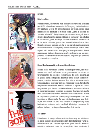 NOVEDADES OTO%u00d1O 2024 %u2022 MANGASERIESSolo LevelingProbablemente, el manwha m%u00e1s popular del momento. Dibujado por DUBU y basado en las novelas de Chungong, ha finalizado con 200 cap%u00edtulos y lleva 11 tomos lanzados en Corea, donde sigue recopilando los cap%u00edtulos en formato f%u00edsico. Cuenta el ascenso del %u201ccazador m%u00e1s d%u00e9bil%u201d, Sung Jinwoo, que pertenece al rango E. Con el objetivo de sufragar los gastos m%u00e9dicos de su madre y los estudios de su hermana, pone en riesgo su vida accediendo a mazmorras en las pocas raids que, por su baja rentabilidad econ%u00f3mica, dejan libres los grandes gremios. Un d%u00eda, lo que parec%u00eda que iba a ser una incursi%u00f3n rutinaria, se complica y Jinwoo tendr%u00e1 que valerse de su ingenio para enfrentarse a unos peligros muy por encima de sus capacidades, tratando de ponerse a salvo a s%u00ed mismo y a sus compa%u00f1eros. Esa experiencia le dar%u00e1 acceso a un poder que cambiar%u00e1 su existencia por completo. C%u00f3mo Raeliana acab%u00f3 en la mansi%u00f3n del duqueBasado en las novelas de Milcha y realizado por Whale, este manwha cerrado con 9 vol%u00famenes es, en gran manera, uno de los referentes dentro del g%u00e9nero de reencarnadas del c%u00f3mic coreano. Lo es gracias a una protagonista de armas tomar con un car%u00e1cter imparable y muchas dosis de retranca. Tras fallecer al caer de un edificio despu%u00e9s de conversar con una misteriosa figura, Park Eunha despierta en el cuerpo de Raeliana McMillan, la hija de una familia burguesa de gran fortuna. Su existencia ser%u00eda un cuento de hadas de no ser porque es un personaje secundario de una novela que ha le%u00eddo y conoce el que ser%u00e1 su desenlace: morir asesinada a manos de su prometido para hacer que la protagonista regrese a casa para investigar su fallecimiento. As%u00ed que, intentando escapar a su destino, se pone manos a la obra para cancelar su compromiso y acaba haciendo un peligroso pacto con Noah Wynknight, un duque del antiguo r%u00e9gimen y protagonista masculino de la novela.The BoxerEsta obra es el trabajo m%u00e1s reciente de Jihun Jung, un artista con un estilo narrativo cinematogr%u00e1fico con identidad propia y una habilidad especial para siempre dejarte con ganas de m%u00e1s. Habiendo concluido online con cerca de 130 cap%u00edtulos, lleva publicados 9