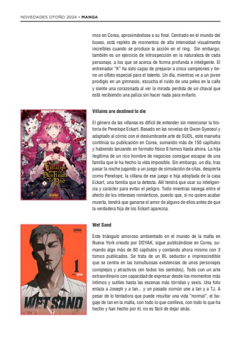 NOVEDADES OTO%u00d1O 2024 %u2022 MANGAmos en Corea, aproxim%u00e1ndose a su final. Centrado en el mundo del boxeo, est%u00e1 repleto de momentos de alta intensidad visualmente incre%u00edbles cuando se produce la acci%u00f3n en el ring. Sin embargo, tambi%u00e9n es un ejercicio de introspecci%u00f3n en la naturaleza de cada personaje, a los que se acerca de forma profunda e inteligente. El entrenador %u201cK%u201d ha sido capaz de preparar a cinco campeones y tiene un olfato especial para el talento. Un d%u00eda, mientras ve a un joven prodigio en un gimnasio, escucha el ruido de una pelea en la calle y siente una corazonada al ver la mirada perdida de un chaval que est%u00e1 recibiendo una paliza sin hacer nada para evitarlo.Villains are destined to dieEl g%u00e9nero de las villanas es dif%u00edcil de entender sin mencionar la historia de Penelope Eckart. Basado en las novelas de Gwon Gyeoeul y adaptado al c%u00f3mic con el deslumbrante arte de SUOL, este manwha contin%u00faa su publicaci%u00f3n en Corea, sumando m%u00e1s de 150 cap%u00edtulos y habiendo lanzando en formato f%u00edsico 6 tomos hasta ahora. La hija ileg%u00edtima de un rico hombre de negocios consigue escapar de una familia que le ha hecho la vida imposible. Sin embargo, un d%u00eda, tras pasar la noche jugando a un juego de simulaci%u00f3n de citas, despierta como Penelope, la villana de ese juego e hija adoptada de la casa Eckart, una familia que la detesta. All%u00ed tendr%u00e1 que usar su inteligencia y car%u00e1cter para evitar el peligro. Todo mientras navega entre el afecto de los intereses rom%u00e1nticos, puesto que, si no quiere acabar muerta, tendr%u00e1 que ganarse el amor de alguno de ellos antes de que la verdadera hija de los Eckart aparezca.Wet SandEste tri%u00e1ngulo amoroso ambientado en el mundo de la mafia en Nueva York creado por DOYAK, sigue public%u00e1ndose en Corea, sumando algo m%u00e1s de 60 cap%u00edtulos y contando ahora mismo con 3 tomos publicados. Se trata de un BL seductor e imprescindible que se centra en las tumultuosas existencias de unos personajes complejos y atractivos (en todos los sentidos). Todo con un arte extraordinario con capacidad de expresar desde los momentos m%u00e1s %u00edntimos y sutiles hasta las escenas m%u00e1s t%u00f3rridas y sexis. Una foto enlaza a Joseph y a Ian... y un pasado com%u00fan une a Ian y a TJ. A pesar de lo tentadora que puede resultar una vida %u201cnormal%u201d, el bagaje de Ian en la mafia, con todo lo que conlleva, con todo lo que ha hecho y han hecho por %u00e9l, no es f%u00e1cil de dejar atr%u00e1s.