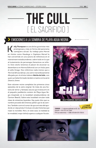 Kelly Thompson es una de las guionistas m%u00e1s prestigiosas y m%u00e1s en forma del panorama comiquero actual. Su trabajo para Marvel en t%u00edtulos como Hawkeye o Capitana Marvel la han convertido en una autora de referencia en elmainstream estadounidense, sobre todo en lo que al tratamiento de personajes femeninos se refiere. Este oto%u00f1o tenemos el placer de anunciar su desembarco en Norma Editorial con un t%u00edtulo para el sello Image. Nos referimos nada menos que a The Cull (El sacrificio), una serie maravillosamente dibujada por el artista italiano Mattia de Iulis, con quien ya hab%u00eda formado t%u00e1ndem creativo en la serie Jessica Jones. Este volumen re%u00fane completos los primeros cinco episodios de la serie original. Se trata de una historia de terror y fantas%u00eda oscura que transcurre en el peque%u00f1o pueblecito costero de Playa Agua Negra (inspirado en la localidad estadounidense de Cannon Beach). Sobre esta localidad circulan toda clase de siniestras leyendas. Hay quien dice que su nombre procede del inmenso pe%u00f1%u00f3n que le da sombra. Tambi%u00e9n corre el rumor de que se trata del apodo de un viejo pirata. E incluso circulan historias que rozan lo incre%u00edble. Pero, en este caso, la realidad (o la irrealidad, mejor dicho) supera a cualquier ficci%u00f3n. TERROR %u2022 1 volumen publicado en EE. UU.Carton%u00e9 %u2022 18 x 27,5 cm. ColorPVP por determinar %u2022 ISBN: 978-84-679-7203-0THE CULL is %u00a9 Kelly Thompson & Mattia De Iulis. All Rights ReservedKELLY THOMPSON / MATTIA DE LULIS%u203a EMOCIONES A LA SOMBRA DE PLAYA AGUA NEGRATHE CULL[ EL SACRIFICIO ] A LA VENTA EN OTO%u00d1O 2024DESCUBRE + C%u00d3MIC AMERICANO - OTO%u00d1O 2024 P%u00c1G. 121 //