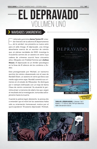 El afamado guionista James Tynion IV, creador literario de la adictiva El departamento de la verdad, nos presenta su nueva serie para el sello Image, El depravado, una intriga absorbente acerca de un escritor de c%u00f3mics que, en plenas navidades de 2023, investiga la truculenta carrera de un asesino en serie cuya cadena de cr%u00edmenes ocurri%u00f3 hace cincuenta a%u00f1os. Dibujada con frialdad forense por Joshua Hixson, El depravado es un thriller psicol%u00f3gico en la l%u00ednea de El silencio de los corderos o Zodiac. Est%u00e1 protagonizado por Michael, un taciturno escritor de c%u00f3mics obsesionado con el caso de Randall Olsen, un asesino en serie que lleva casi medio siglo entre rejas. Randall cometi%u00f3 sus cr%u00edmenes en el estado de Milwaukee. Se distingu%u00eda por ir siempre disfrazado con un traje de Santa Claus de centro comercial. Su atuendo le permit%u00eda atraer a menores de edad a los que, seg%u00fan el resultado de la investigaci%u00f3n, torturaba salvajemente hasta la muerte. Cuando la polic%u00eda logr%u00f3 detenerlo, la prensa dio a entender que el m%u00f3vil de los asesinatos hab%u00eda sido su orientaci%u00f3n homosexual, motivo por el que lo apodaron %u201cEl asesino depravado%u201d. Michael, THRILLER / G%u00c9NERO NEGRO %u2022 Volumen 1 de 2R%u00fastica %u2022 17 x 26 cm. Color, PVP por determinarISBN: 978-84-679-7223-8THE DEVIANT is %u2122 and %u00a9 James Tynion IV & Joshua Hixson. All Rights Reserved.JAMES TYNION IV / JOSHUA HIXSON%u203a NAVIDADES SANGRIENTASEL DEPRAVADOPR%u00d3XIMAMENTE A LA VENTADESCUBRE + C%u00d3MIC AMERICANO - OTO%u00d1O 2024 P%u00c1G. 147 // VOLUMEN UNO