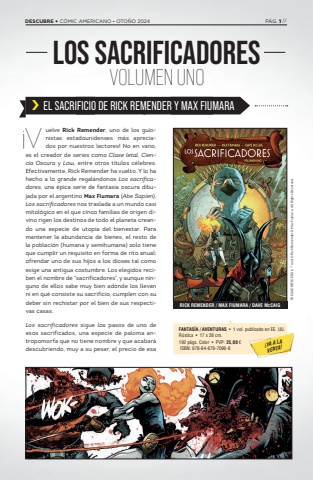 Vuelve Rick Remender, uno de los guionistas estadounidenses m%u00e1s apreciados por nuestros lectores! No en vano, es el creador de series como Clase letal, Ciencia Oscura y Low, entre otros t%u00edtulos c%u00e9lebres. Efectivamente, Rick Remender ha vuelto. Y lo ha hecho a lo grande regal%u00e1ndonos Los sacrificadores, una %u00e9pica serie de fantas%u00eda oscura dibujada por el argentino Max Fiumara (Abe Sapien). Los sacrificadores nos traslada a un mundo casi mitol%u00f3gico en el que cinco familias de origen divino rigen los destinos de todo el planeta creando una especie de utop%u00eda del bienestar. Para mantener la abundancia de bienes, el resto de la poblaci%u00f3n (humana y semihumana) solo tiene que cumplir un requisito en forma de rito anual: ofrendar uno de sus hijos a los dioses tal como exige una antigua costumbre. Los elegidos reciben el nombre de %u201csacrificadores%u201d, y aunque ninguno de ellos sabe muy bien ad%u00f3nde los llevan ni en qu%u00e9 consiste su sacrificio, cumplen con su deber sin rechistar por el bien de sus respectivas casas. Los sacrificadores sigue los pasos de uno de esos sacrificados, una especie de paloma antropomorfa que no tiene nombre y que acabar%u00e1 descubriendo, muy a su pesar, el precio de esa %u00a1FANTAS%u00cdA / AVENTURAS %u2022 1 vol. publicado en EE. UU.R%u00fastica %u2022 17 x 26 cm. 192 p%u00e1gs. Color %u2022 PVP: 25,00 %u20ac ISBN: 978-84-679-7096-8LOS SACRIFICADORESVOLUMEN UNOTHE SACRIFICERS is %u2122 and %u00a9 Rick Remender & Max Fiumara. All Rights Reserved.RICK REMENDER / MAX FIUMARA / DAVE MCCAIG%u00a1YA A LAVENTA!%u203a EL SACRIFICIO DE RICK REMENDER Y MAX FIUMARADESCUBRE + C%u00d3MIC AMERICANO - OTO%u00d1O 2024 P%u00c1G. 1 //