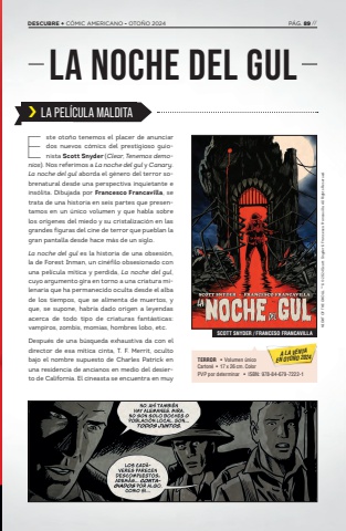 Este oto%u00f1o tenemos el placer de anunciar dos nuevos c%u00f3mics del prestigioso guionista Scott Snyder (Clear, Tenemos demonios). Nos referimos a La noche del gul y Canary. La noche del gul aborda el g%u00e9nero del terror sobrenatural desde una perspectiva inquietante e ins%u00f3lita. Dibujada por Francesco Francavilla, se trata de una historia en seis partes que presentamos en un %u00fanico volumen y que habla sobre los or%u00edgenes del miedo y su cristalizaci%u00f3n en las grandes figuras del cine de terror que pueblan la gran pantalla desde hace m%u00e1s de un siglo. La noche del gul es la historia de una obsesi%u00f3n, la de Forest Inman, un cin%u00e9filo obsesionado con una pel%u00edcula m%u00edtica y perdida, La noche del gul, cuyo argumento gira en torno a una criatura milenaria que ha permanecido oculta desde el alba de los tiempos, que se alimenta de muertos, y que, se supone, habr%u00eda dado origen a leyendas acerca de todo tipo de criaturas fant%u00e1sticas: vampiros, zombis, momias, hombres lobo, etc. Despu%u00e9s de una b%u00fasqueda exhaustiva da con el director de esa m%u00edtica cinta, T. F. Merrit, oculto bajo el nombre supuesto de Charles Patrick en una residencia de ancianos en medio del desierto de California. El cineasta se encuentra en muy TERROR %u2022 Volumen %u00fanicoCarton%u00e9 %u2022 17 x 26 cm. ColorPVP por determinar %u2022 ISBN: 978-84-679-7222-1NIGHT OF THE GHOUL %u2122 & %u00a9 2024 Scott Snyder & Francesco Francavilla. All Rights Reserved.SCOTT SNYDER / FRANCESO FRANCAVILLA%u203a LA PEL%u00cdCULA MALDITALA NOCHE DEL GUL A LA VENTA EN OTO%u00d1O 2024DESCUBRE + C%u00d3MIC AMERICANO - OTO%u00d1O 2024 P%u00c1G. 89 //