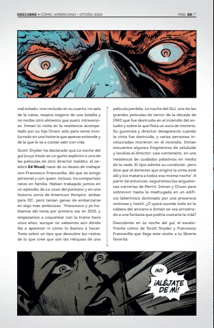 mal estado: vive recluido en su cuarto, no sale de la cama, respira ox%u00edgeno de una botella y no recibe otro alimento que suero intravenoso. Inman lo visita en la residencia acompa%u00f1ado por su hijo Orson solo para verse involucrado en una historia que apenas entiende y de la que le va a costar salir con vida. Scott Snyder ha declarado que La noche del gul (cuyo t%u00edtulo es un gui%u00f1o expl%u00edcito a una de las pel%u00edculas de otro director maldito, el c%u00e9lebre Ed Wood) nace de su deseo de trabajar con Francesco Francavilla, del que es amigo personal y con quien, incluso, ha compartido ratos en familia. Hab%u00edan trabajado juntos en un episodio de La cosa del pantano y en una historia corta de American Vampire, ambas para DC, pero ten%u00edan ganas de embarcarse en algo m%u00e1s ambicioso. %u201cFrancesco y yo hablamos del tema por primera vez en 2015, y empezamos a coquetear con la trama hace unos a%u00f1os, aunque no sab%u00edamos a%u00fan d%u00f3nde iba a aparecer ni c%u00f3mo lo %u00edbamos a hacer. Trata sobre un tipo que descubre los restos de lo que cree que son las reliquias de una pel%u00edcula perdida, La noche del Gul, una de las grandes pel%u00edculas de terror de la d%u00e9cada de 1940 que fue destruida en el incendio del estudio y sobre la que flota un aura de misterio. Su guionista y director desapareci%u00f3 cuando la cinta fue destruida, y varias personas involucradas murieron en el incendio. Inman encuentra algunos fragmentos de celuloide y localiza al director, casi centenario, en una residencia de cuidados paliativos en medio de la nada. El tipo admite su condici%u00f3n, pero dice que el demonio que origin%u00f3 la cinta est%u00e1 all%u00ed y los matar%u00e1 a todos esa misma noche%u201d. A partir de entonces, seguiremos las angustiosas correr%u00edas de Merrit, Inman y Orson para sobrevivir hasta la madrugada en un edificio laber%u00edntico dominado por una presencia ominosa y hostil. %u00bfO quiz%u00e1 suceda todo en la cabeza del anciano e Inman se vea arrastrado a una fantas%u00eda que podr%u00eda costarle la vida? Desc%u00fabrelo en La noche del gul, el escalofriante c%u00f3mic de Scott Snyder y Francesco Francavilla que llega este oto%u00f1o a tu librer%u00eda favorita.DESCUBRE + C%u00d3MIC AMERICANO - OTO%u00d1O 2024 P%u00c1G. 90 //